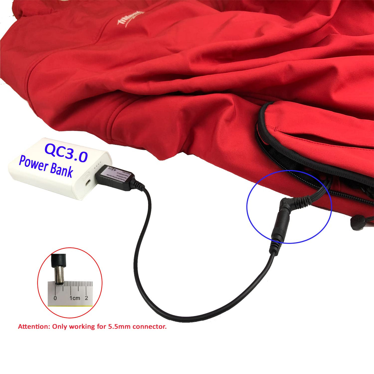 Parameters: Iput Voltage 5V And Excited Qc3.0 Power Bank Output:12V Max Working Current: 12V 2A Lines Size: 2*20Awg Cable Length: 20Cm / 98Inches Color: Black Features: Not Fit Bosch, Kobalt , Smarkey Heat Jacket! Jacket Cannot Working If Usb Outlet1.0A Or 2.0A(Most Of Old Version Power Bank) Make Sure Power Bank Is Qc3.0 Power Bank - Heavy Duty Copper Wire - 12V Heated Jacket Step-Up Usb Cable Support Metabo / Milwaukee / Snap-On / Craftsman / Aeg Heated Jacket - Dc Output 12V 2000 Ma Max Packing Include: 1Pc Battery Heated Jacket 12V Step-Up Charger Cable