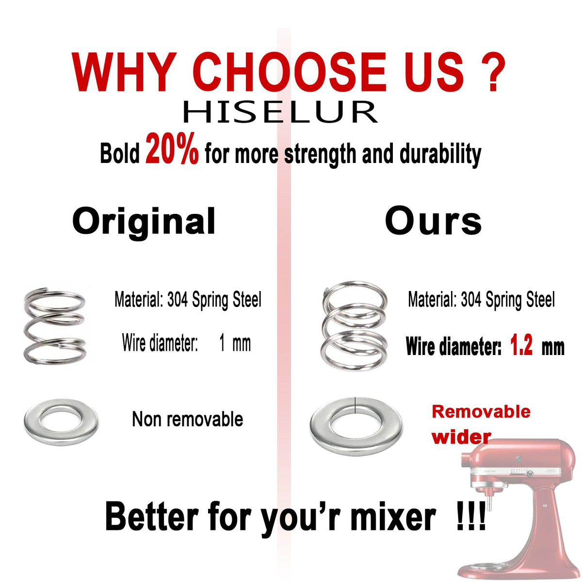 Q: How thick is the spring compared to the original KitchenAid parts?A: This spring is 20% thicker than the original KitchenAid parts, providing more power and stability for your mixing tasks.