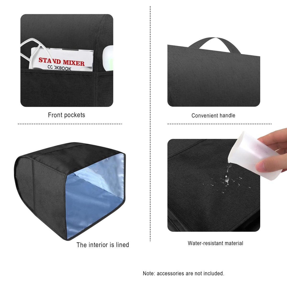 Protect Your Valuable Stand Mixer From Erosive Kitchen Vapor, Dust Or Lampblack!Sturdy, Plain Water-Resistant Nylon Fabric With Neat Stitches Effectively Wards Off Dings, Scratches, Dust And Food Splashes, Perfectly Fits Your Nice Looking Stand Mixer And Blends Into The Decor In The Kitchen Just Fine.Features1.Well Made Of Water-Resistant Nylon. Shrink Resistant. Easy To Clean.2.The Interior Is Lined.Machine Washable.3. One Convenient ''Handle'' On Top Is For Easy Removing.4.Convenient 3 Pocket Design: 1 Large Front Pocket And 2 Side Pockets Provide Plenty Of Storage Space For Keeping Extras Such As Beater Attachments And Recipe Booklets.5.Water-Proof - Surface Material Made Of Polyester Taffeta, Keep The Machine From Erosion By The Vapor.Tips:Please Do Not Use The Product Close To The Fire.Package List:1 * Stand Mixer Cover With A Storage Bag(Black)Easy To Store Cover Is Packed In The Mini Size Storage Bag Included.It Is A Great Gift For Kitchen Appliances.