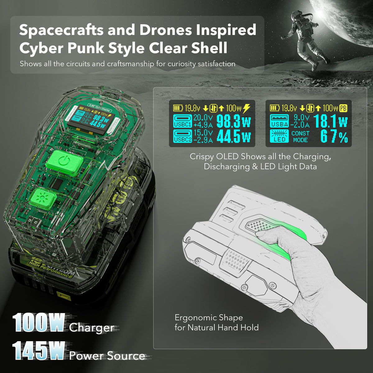 Symik 100W Charger & 145W Power Source For Ryobi 18V Batteries, Advanced Two Way Charger & Portable Power Source W/Oled Screen F