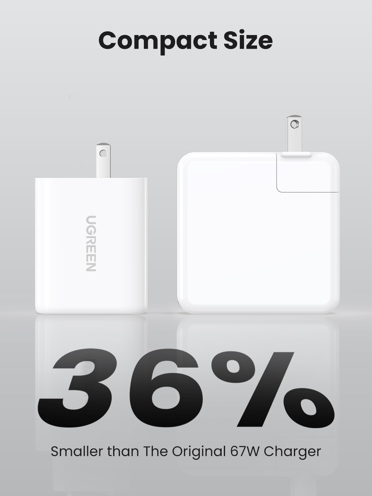 Q: What is the size of the UGREEN 65W USB C Charger?A: The charger is compact with dimensions of 2.01 x 1.26 x 2.42 inches and features a foldable plug, making it portable and easy to carry wherever you go.