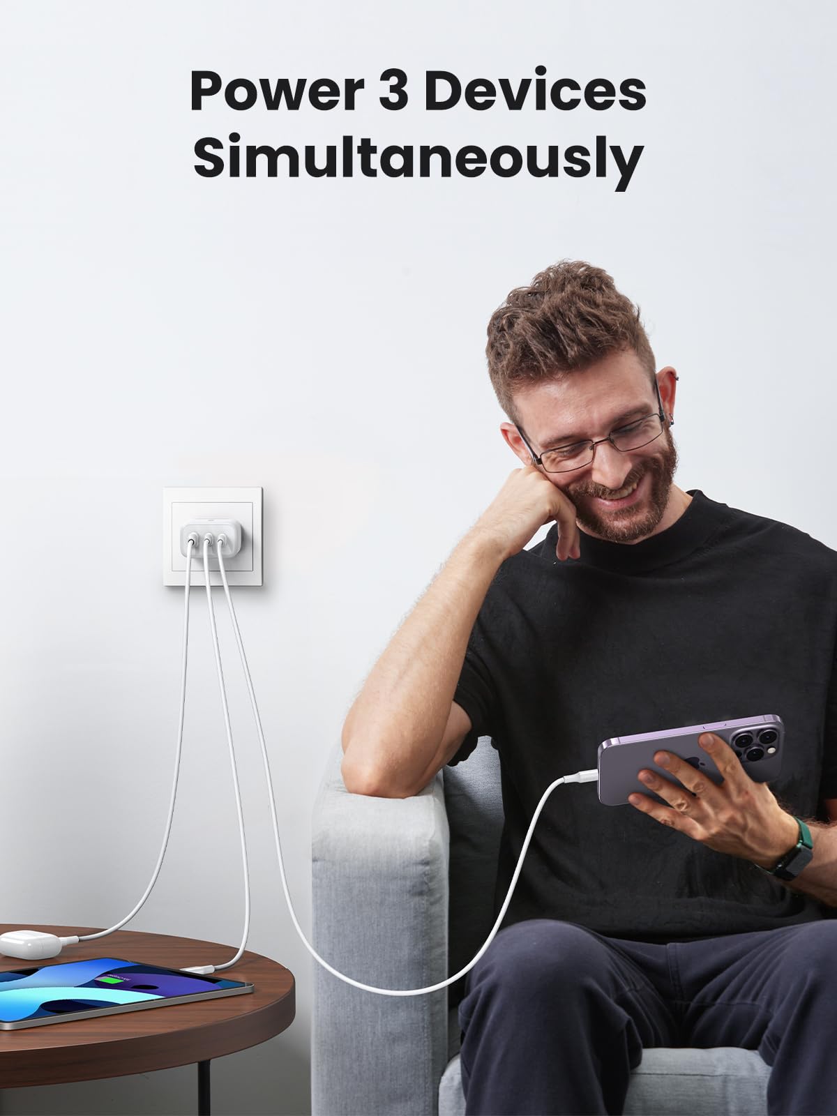 Ugreen 65W Usb C Charger, 3 Ports Compact Foldable Fast Wall Charger Block, Usb C Power Adapter For Macbook Pro/Air, Iphone 16/1