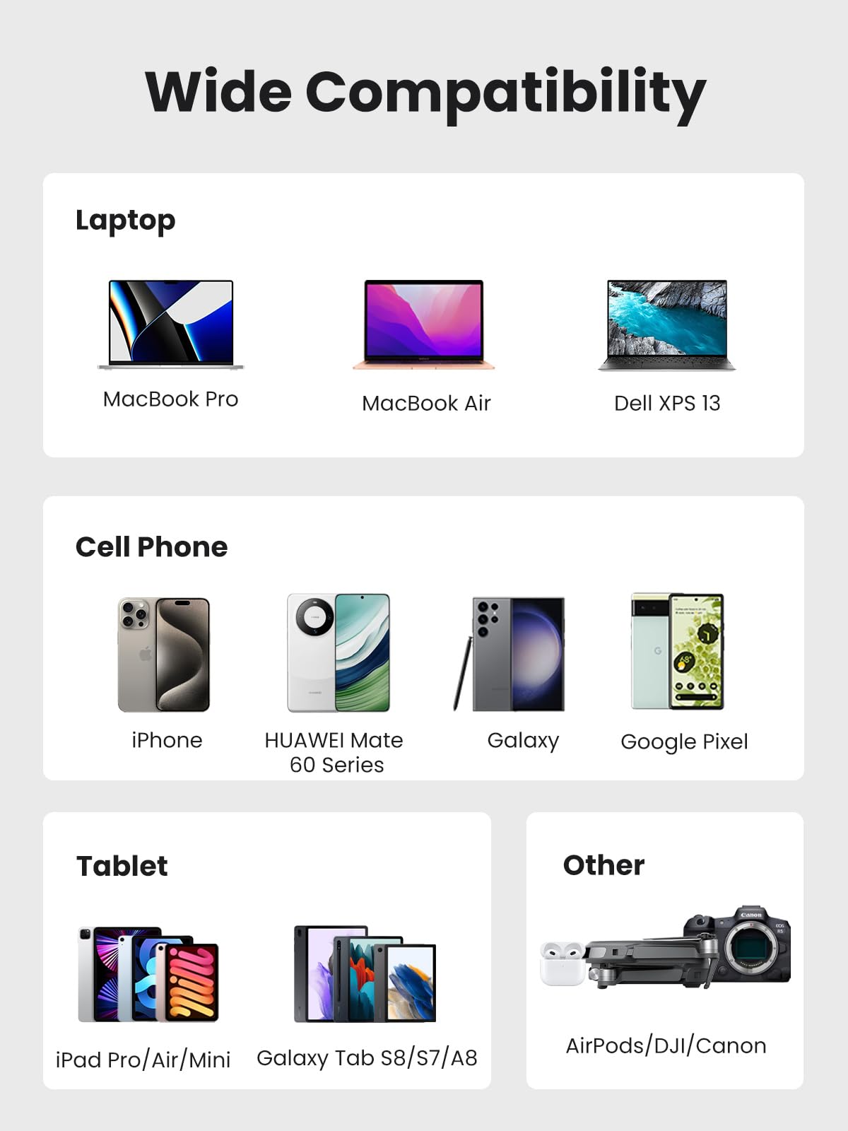 Q: What devices are compatible with the UGREEN 65W USB C Charger?A: The UGREEN 65W USB C Charger is compatible with a wide range of devices including MacBook Pro, MacBook Air, iPad Pro, iPad Air, iPhone models 15/14/13/12/11/X/XS/XS MAX/8, various Galaxy S series models, Nintendo Switch, Steam Deck, and Google Pixel phones.
