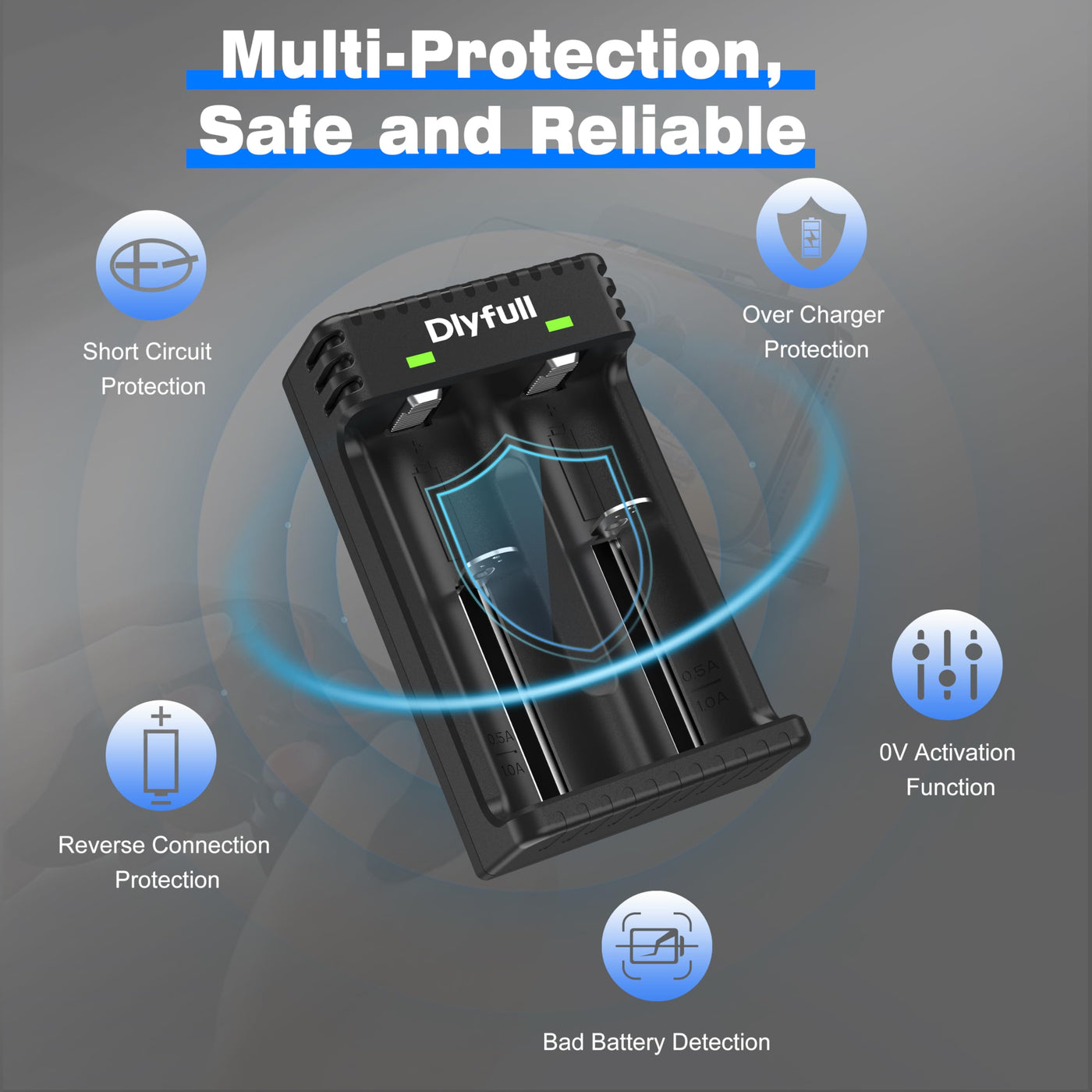 Q: How does the Dlypow charger ensure safety while charging?A: The Dlypow 18650 Battery Charger features multiple safety guards, including advanced PWM control technology. It has a 0V/low-voltage activation function, overcharge protection, short-circuit protection, and the ability to detect non-rechargeable and defective batteries to ensure safe charging.