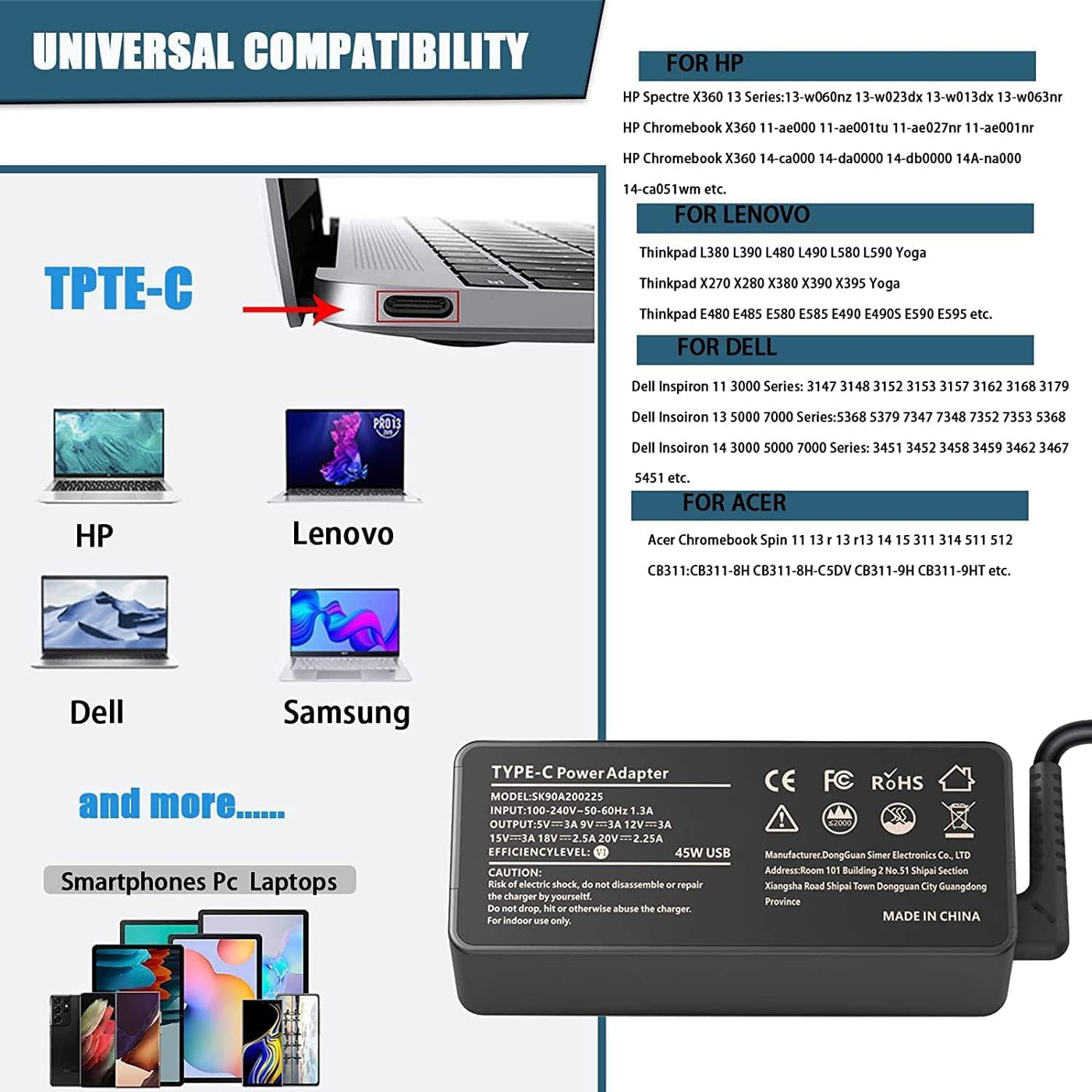 Usb C 45W Charger Laptop Charger, Universal Power Adapter For Hp, Lenovo, Dell, Acer, Asus, Samsung, Google Laptop Chromebook Power Supply Cord