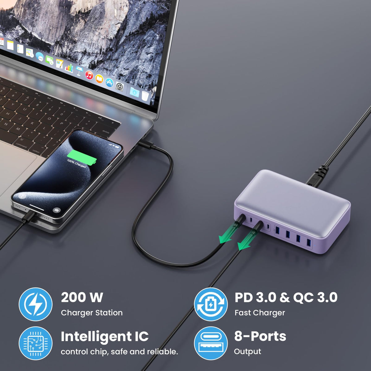 Q: How many devices can I charge simultaneously with this charger?A: You can charge up to 8 devices simultaneously with the USB C Charger 200W, thanks to its 8 independent output ports, which ensures all devices charge at full speed without power sharing.