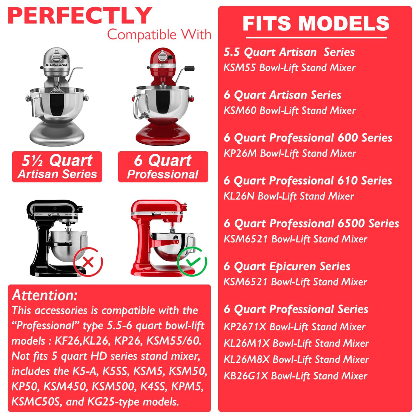Q: What KitchenAid models are compatible with the Wiselet Stainless Steel Accessories?A: The Wiselet Stainless Steel Accessories are designed to fit KitchenAid 5.5-6 quart bowl-lift stand mixers, specifically models KP26, KL26, KB26, KSM55, and KSM60, ensuring a secure and optimal performance.