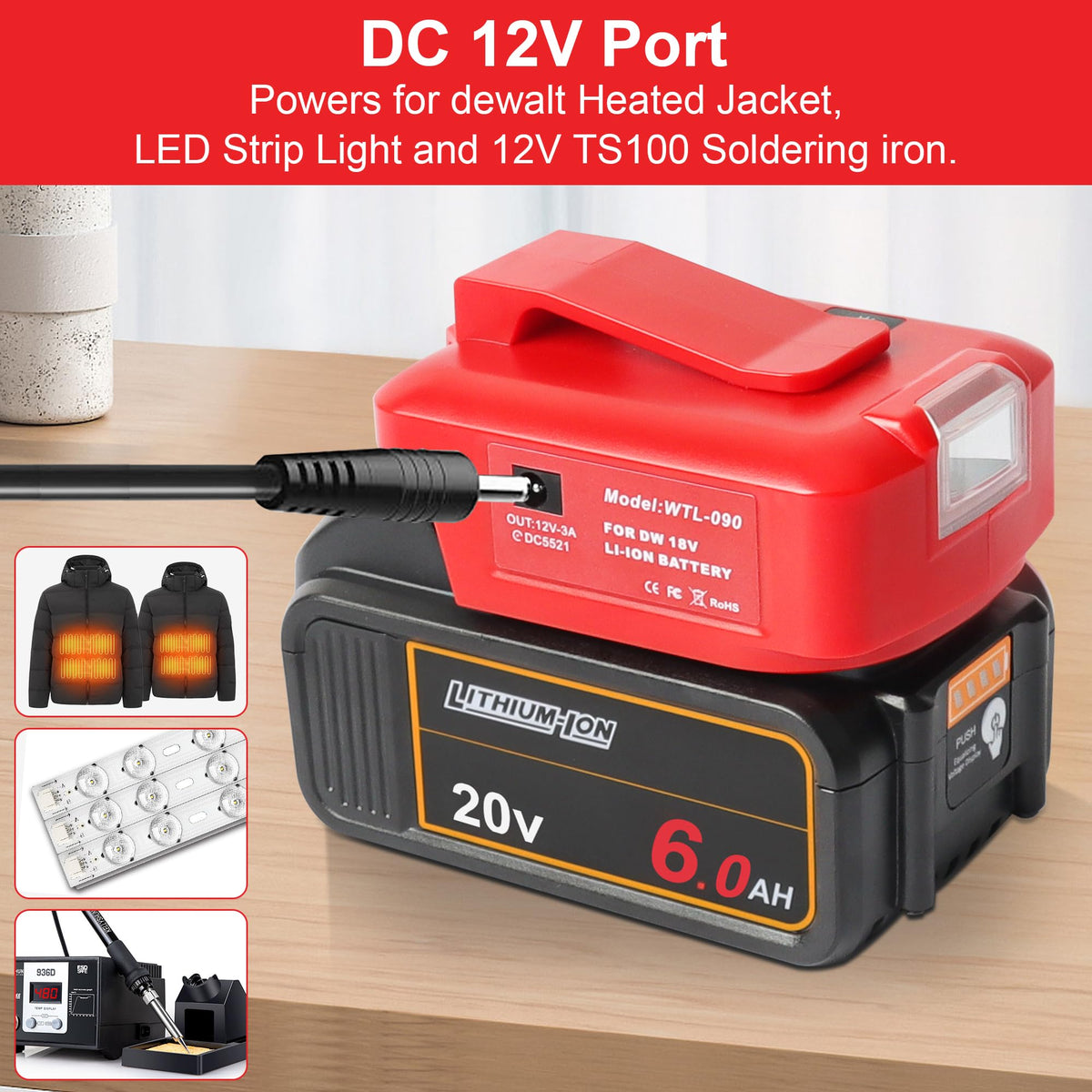 Q: What features differentiate the Xinriga Power Adapter from other battery chargers?A: The Xinriga Power Adapter stands out with its dual USB ports, a 12V DC port, and compatibility with both Milwaukee and DEWALT batteries, offering a multifunctional solution for charging and powering devices.