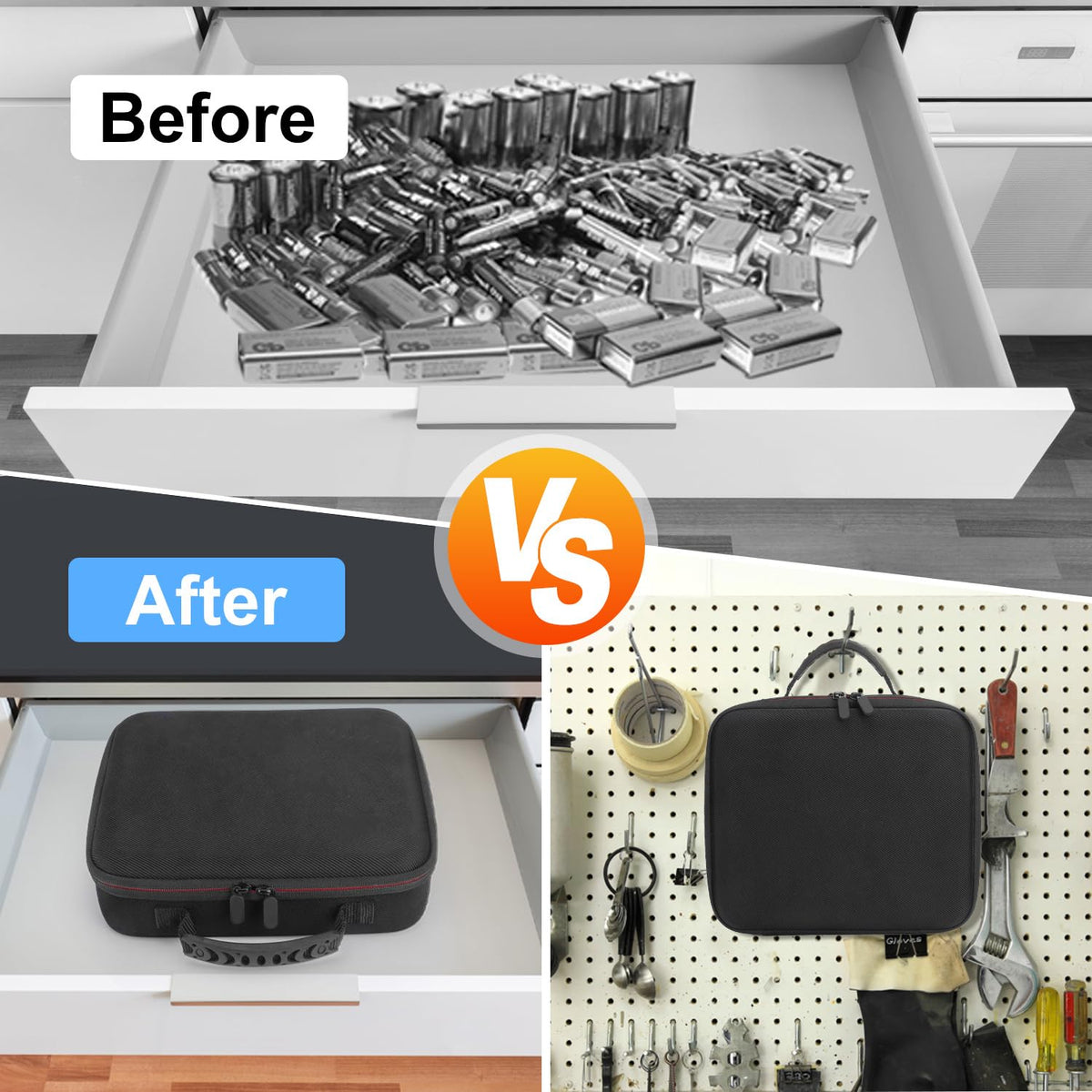 Q: Is the Battery Organizer waterproof?A: Yes, the Battery Holder Organizer is crafted from durable hard EVA material that provides excellent waterproof protection. This feature helps to keep your batteries safe from moisture, prolonging their lifespan and ensuring optimal performance.
