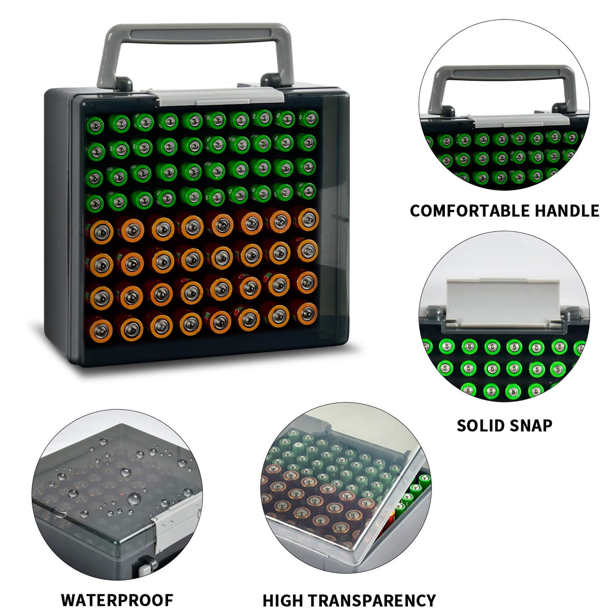Q: Is this battery organizer portable?A: Yes, the compact and portable design of the battery holder features a strong latch for easy opening and closing, along with a top handle for convenient carrying, making it easy to store in closets, shelves, or drawers.