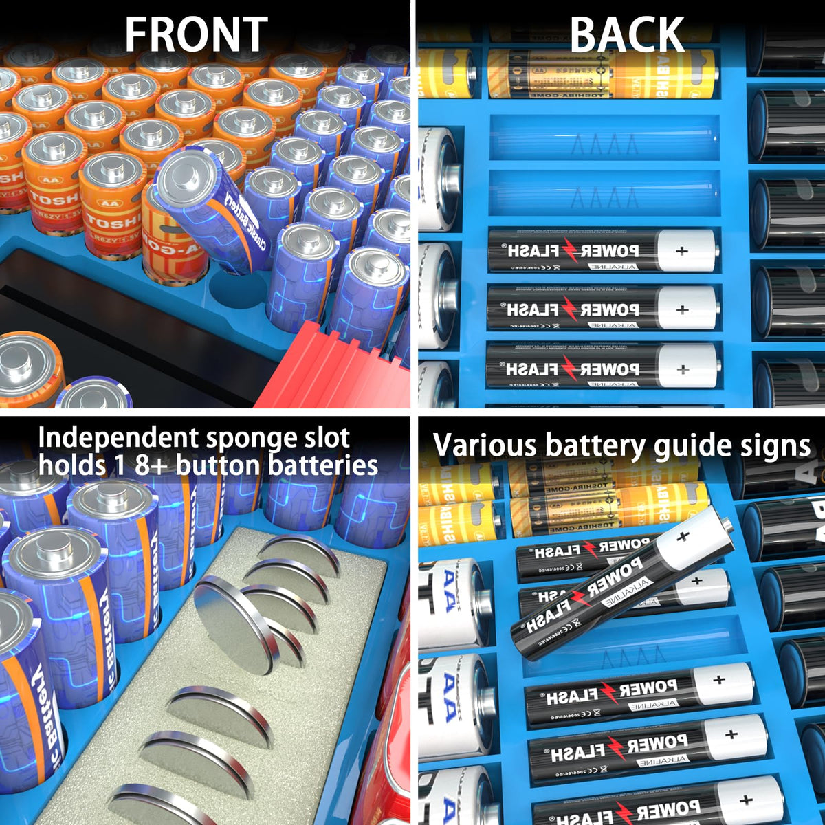 Q: How does the double-sided design of the battery storage case work?A: The double-sided design features vertical storage on one side for larger batteries and horizontal storage on the other side for smaller batteries, maximizing space and organization.