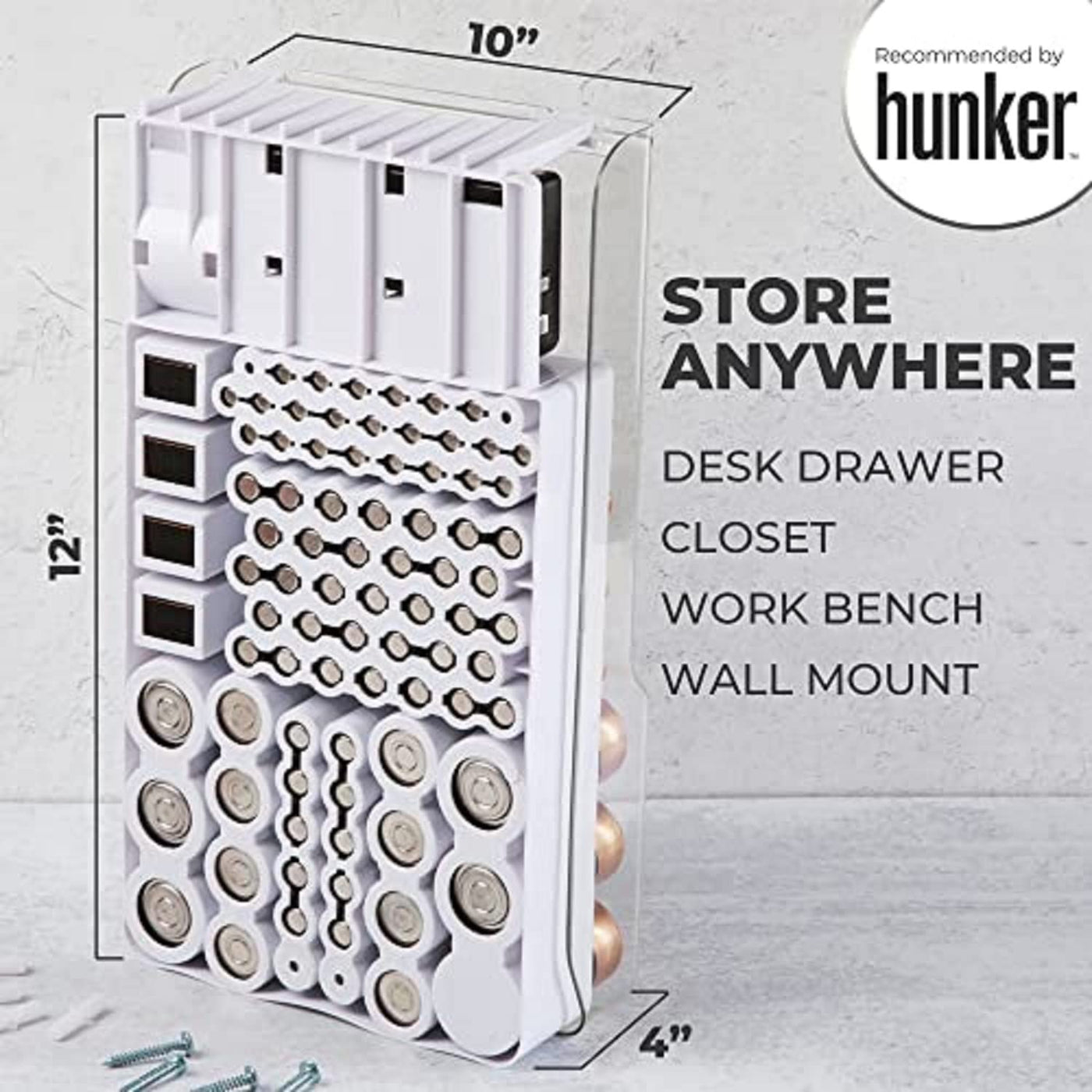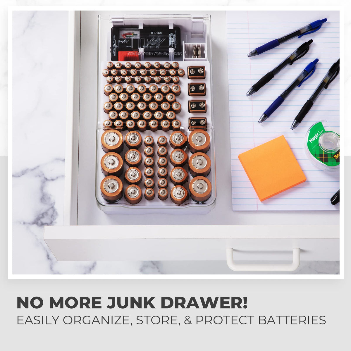 Great Item To Eliminate Your Cluttered Drawers And Closets. Helps Keep Your Batteries Neat And Organized! Also Includes A Battery Tester That You Can Easily Remove. The Tester Doesn'T Require Any Batteries For Operation. It Works On The Power Of The Battery You Are Testing! You Can Store It Conveniently In Your Drawer, Closet Or You Can Mount It On The Wall. Stores Up To 93 Batteries In Various Sizes! Including 45 Aa, 25 Aaa, 4 9 Volt, 8 C, 6 D And A ''Swing Drawer'' For 5 Flat Batteries.