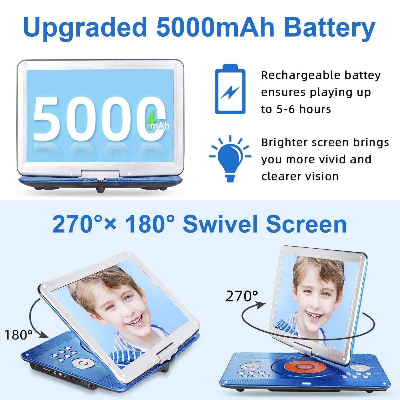 16.9'' Portable Mobile Dvd Player With 14.1'' Large Swivel Screen With 6 Hrs Rechargeable Battery For Kids, Sync Tv, Support Usb