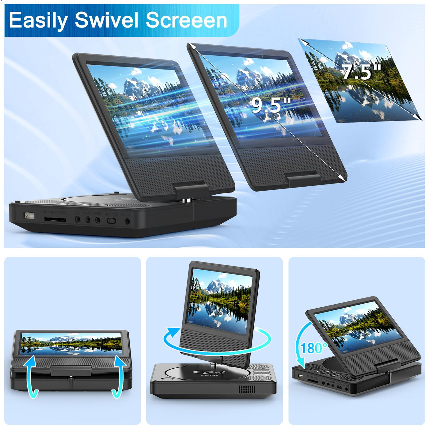 9.5'' Portable Dvd Player With 7.5'' Swivel Display Screen, 5 Hour Built In Rechargeable Battery, Car Dvd Player,Supports Sd Car