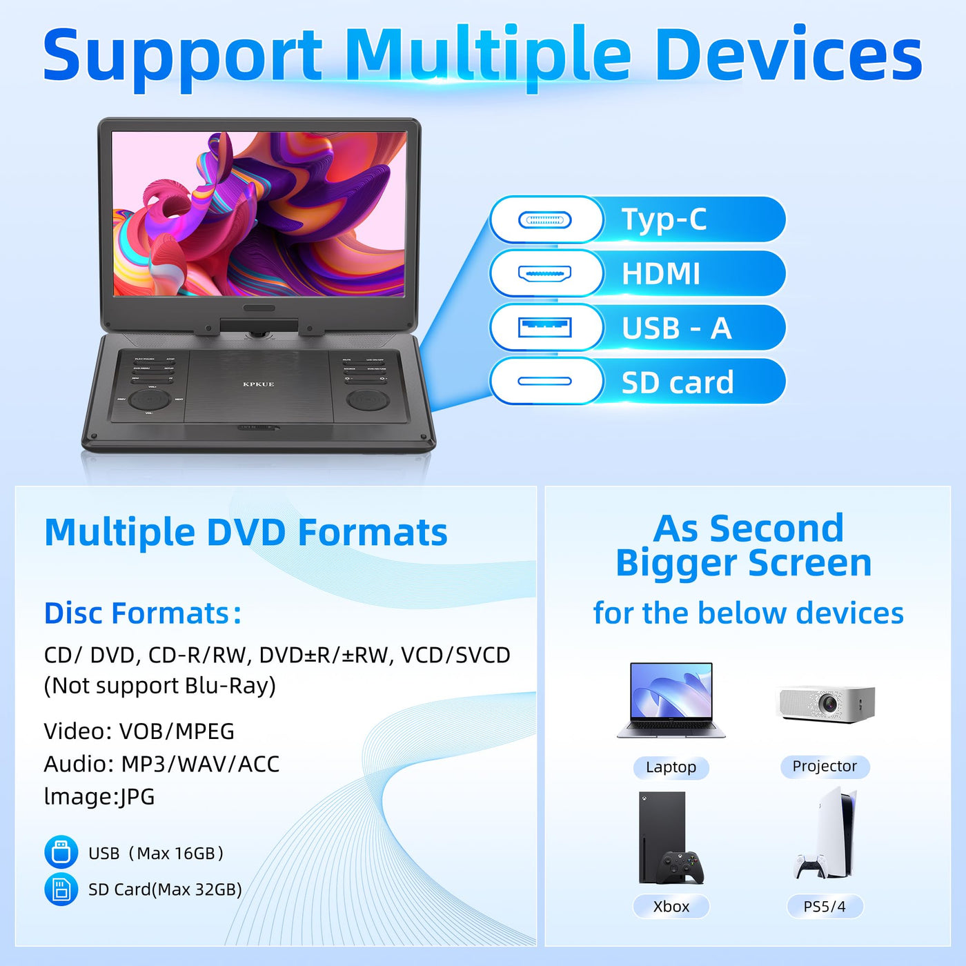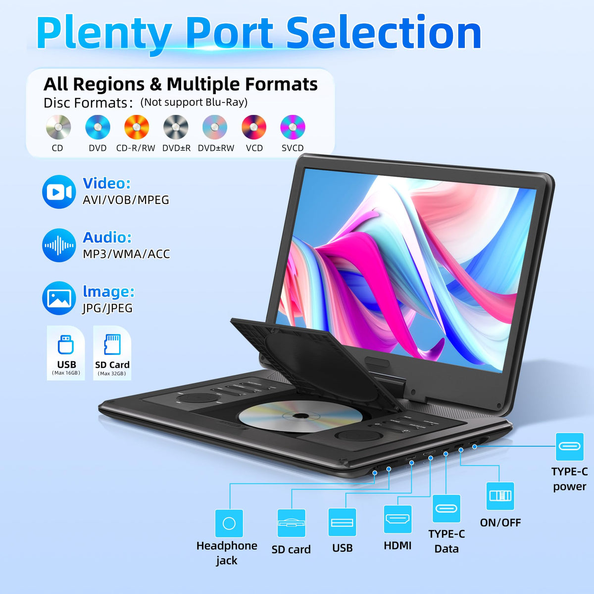 Kpkue 15.6'' Fhd Portable Dvd Player With 13.3'' Swivel Screen, 1920 * 1080P Car Player For Kids, 4 Hours Rechargeable Battery S