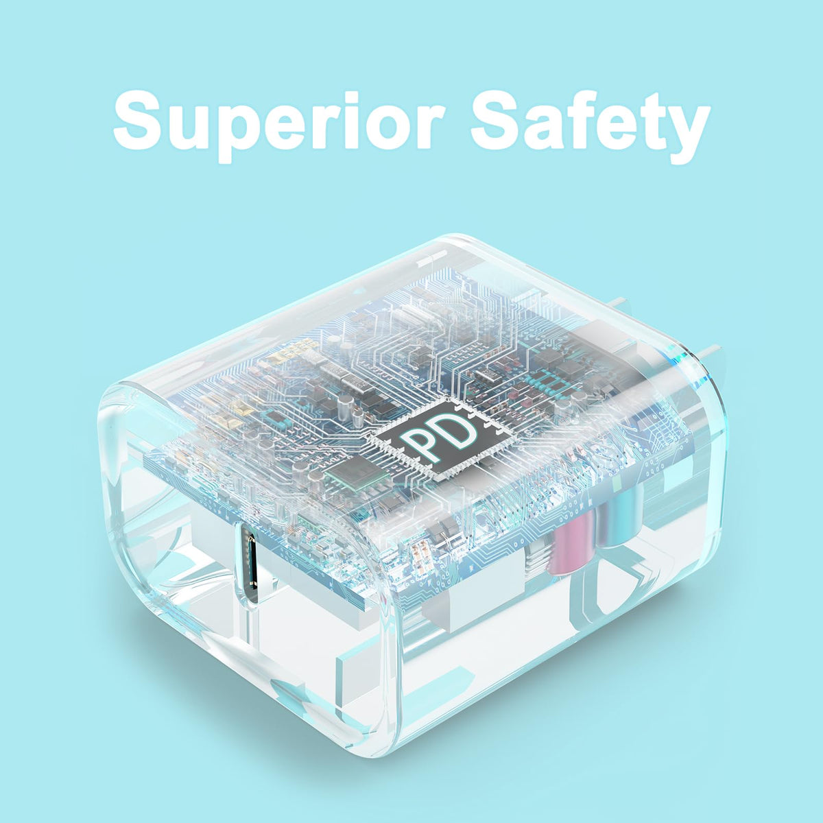 Q: What safety features does this charger have?A: The iGENJUN 20W USB C Charger is equipped with advanced safety features, including over-current, over-voltage, over-heat, and short-circuit protection. These features help ensure safe and reliable charging for your devices.