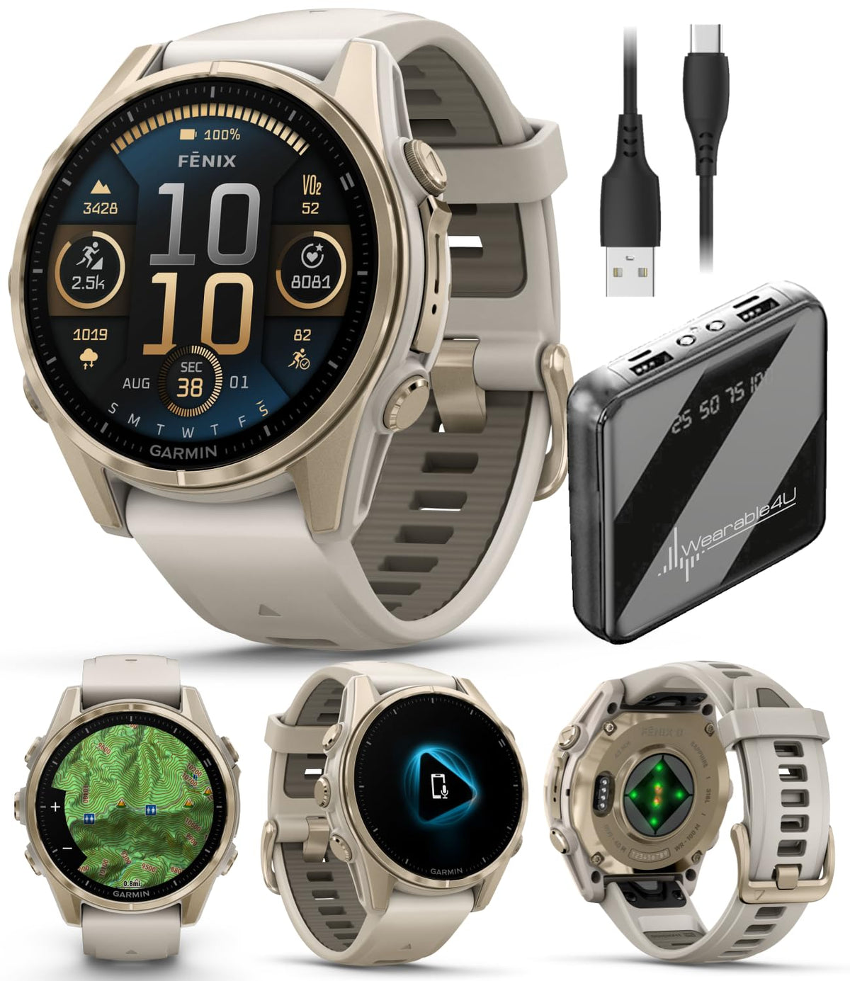 Wearable4U Garmin Fenix 8 - 43 Mm Sapphire, Amoled Multisport Gps Smartwatch, Soft Gold With Fog Gray/Dark Sandstone Silicone Ba