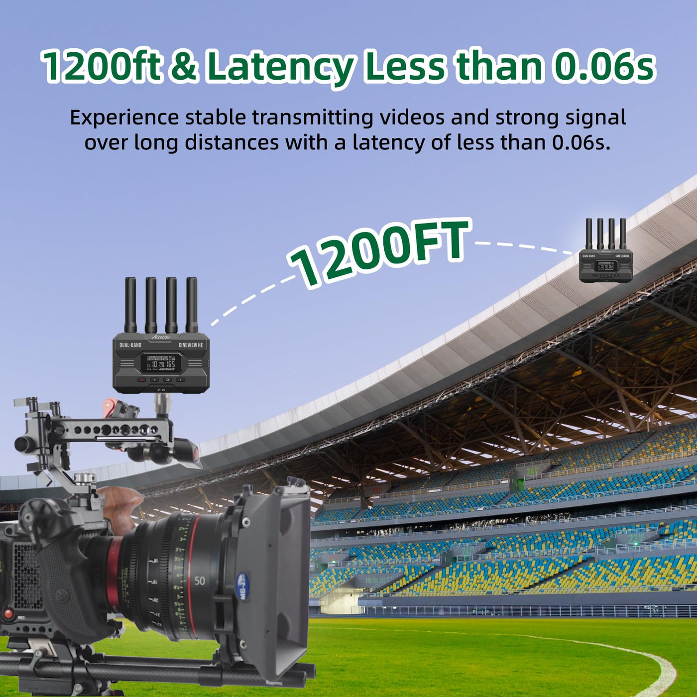 Q: What is the maximum range and latency of the Accsoon CineView HE Wireless Video Transmitter and Receiver?A: The Accsoon CineView HE provides an impressive range of up to 1200 feet with a latency of less than 0.06 seconds, ensuring stable and smooth video and audio transmission even across long distances.