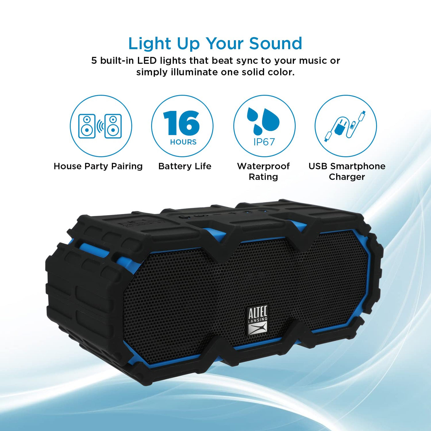 Make Enjoying Your Favorite Music In The Outdoors Simpler With Altec Lansing Waterproof Mini Speakers!We Designed Our Mini Waterproof Speakers To Provide Just The Right Fit For All Your Outdoor Activities To Light Up Any Party And Keep It Going For Longer! Its Designed With Powerful Speakers And Dancing Led Lights That Set The Right Tone For A Night Of Enjoyment And Fun For Everyone.Compact, Versatile & Durable - Made For Everyday Usealtec Lansing Mini Bluetooth Speaker Is Made Using Durable Materials And A Waterproof Design So You Can Take The Party With You On The Go. They Are Suitable For Use In Most Weather Conditions Making Them Ideal For Both Indoor And Outdoor Parties, Bbqs, And Other Events.Elevate Your Music Experience & Enjoy Longer Playtimesour Loud Bluetooth Speaker Features A Rechargeable Battery That Can Provide Up To 16 Hours Of Battery Time On A Single Charge. It Pairs Up Seamlessly With Most Bluetooth Devices To Deliver Powerful Sound While Maintaining Clarity So You Can Listen To Your Favorite Songs The Right Way!More Features Youll Love:- Its Ip67 Waterproof And Floats On Water When Dropped- Thanks To The Mini Design And Lightweight Its Perfect For Travel- Can Be Charged Through Any Usb Power Outlet On The Go- Maintains A Stable Connection Up To 100 Feet Even When Moving- Designed With Led Lights That Dance To The Beat Of The Musictake The Party With You Anywhere You Go Without Worrying About The Weather With Altec Lansing Portable Bluetooth Speaker!
