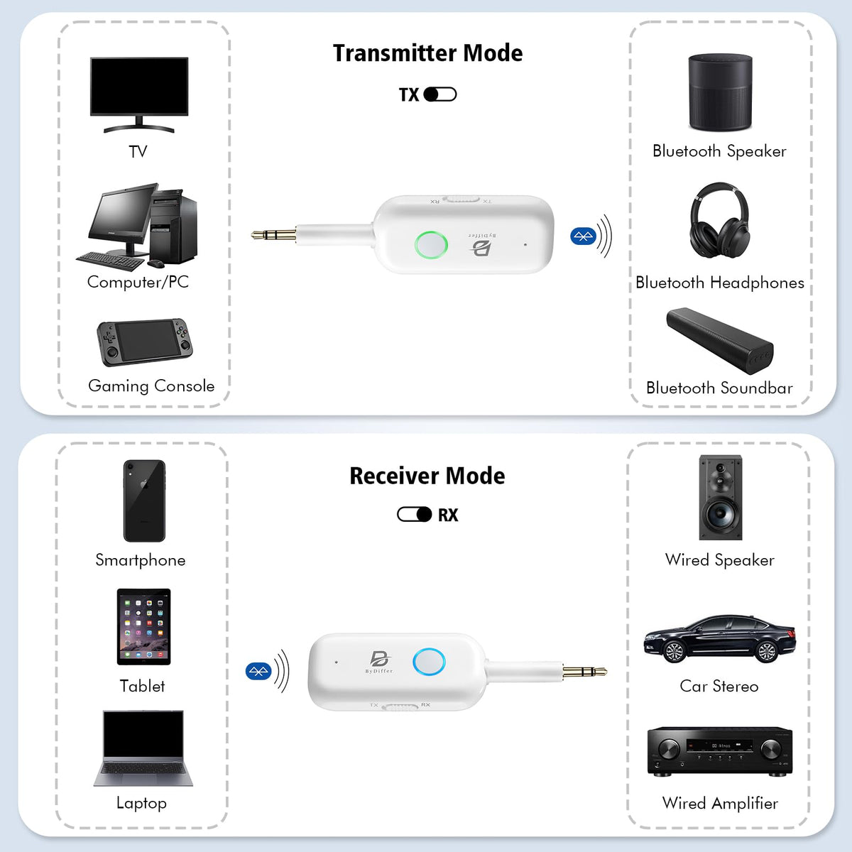 Bluetooth 5.2 Audio Transmitter Receiver For Tv To 2 Headphones, Bydiffer Wireless Dual Link 3.5Mm Jack Aptx Low Latency Aux Bluetooth Adapter For Car, Airplane, Gym, Pc (White)