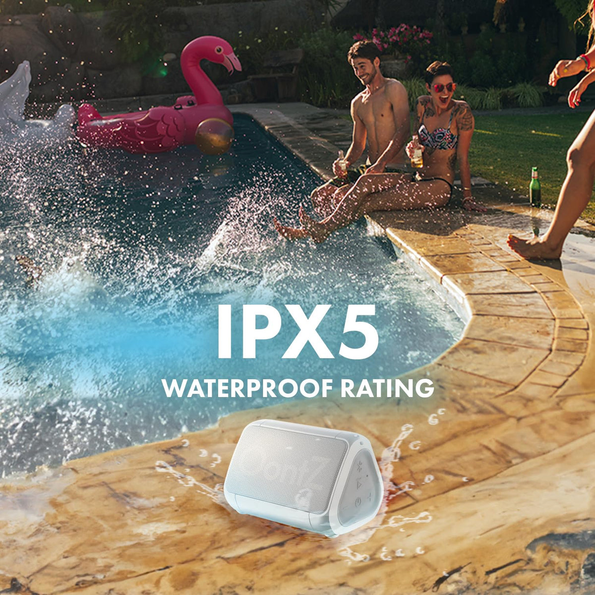 Q: Is the OontZ Solo Portable Speaker water-resistant?A: Yes, the OontZ Solo Portable Speaker has an IPX5 water-resistance rating, making it splash-proof and suitable for outdoor use at the beach or poolside, but it is not designed to be submerged in water.