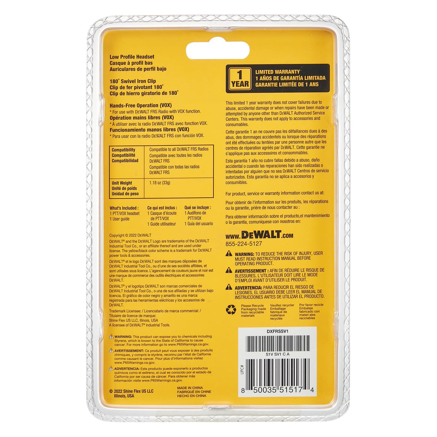 The Dewalt Dxfrssv1 Headset Is Compatible With Dewalt Frs Walkie Talkie Two-Way Radios (Dxfrs300 And Dxfrs800). Stealth - Savvy Headset With Push-To-Talk (Ptt) And Voice Operated Switch (Vox) Button. Covert Air Acoustic Tube. 180? Swivel Iron Clip. 63'' Cable Length. Limited Lifetime Warranty; Warranty Only Valid By Authorized Resellers.