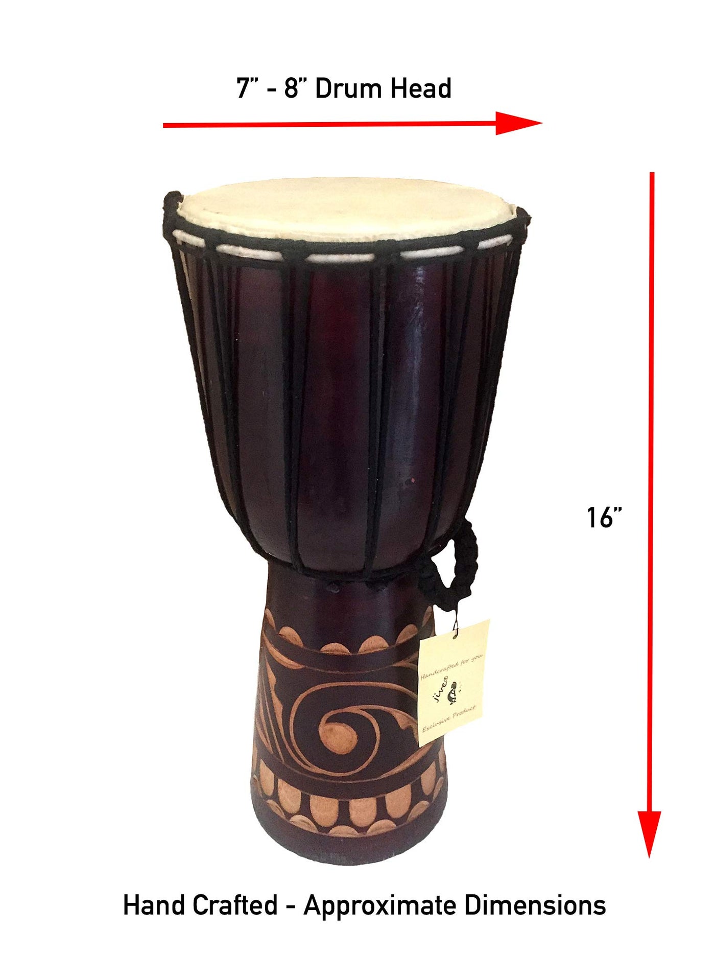 A Perennial Favorite Among Music Lovers, The Djembe Drum, Has Become Very Popular In The Western Music World. Played With With Bare Hands Slapping The Goat Skin Drum Head, It Produces A Rich, Vibrant, Resonating Sound. Handcarved From A Single Piece Of Local Hardwood And Enhanced With A Traditional Carvings, This Drum Is Sure To Please Any Music Lover. We Carry An Assortment Of These Drums And Since Each Piece Is Hand Carved Designs And Color Of The Trbal Motif May Vary. The Drum You Receive May Differ From The Picture. Materials: Wood &Amp; Goatskin Handmade - Please Allow For Minor Variations. Tribal Motif May Vary From Picture. Dimensions- 16''H X 9''W - Drum Head Is Approximately 7.5-8''