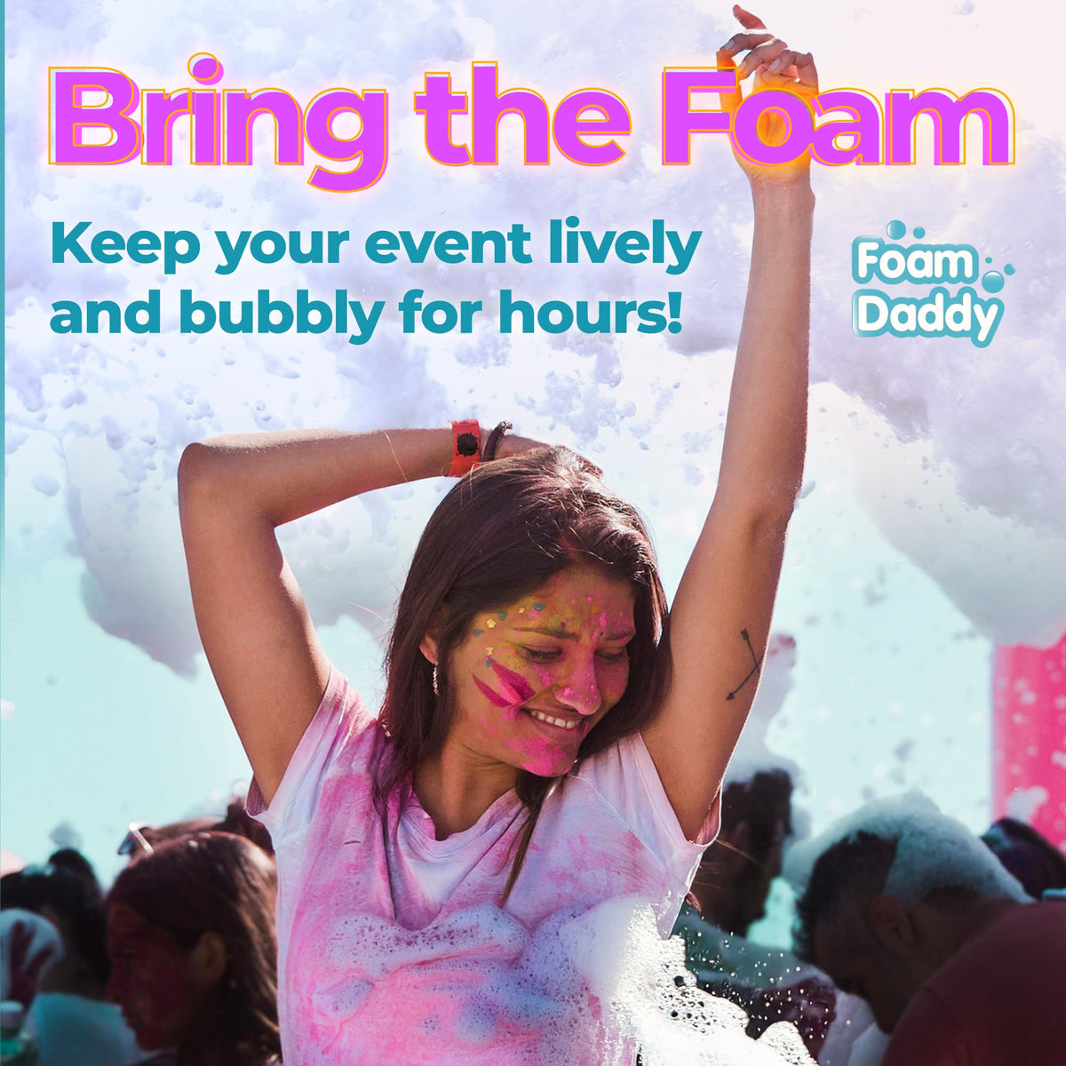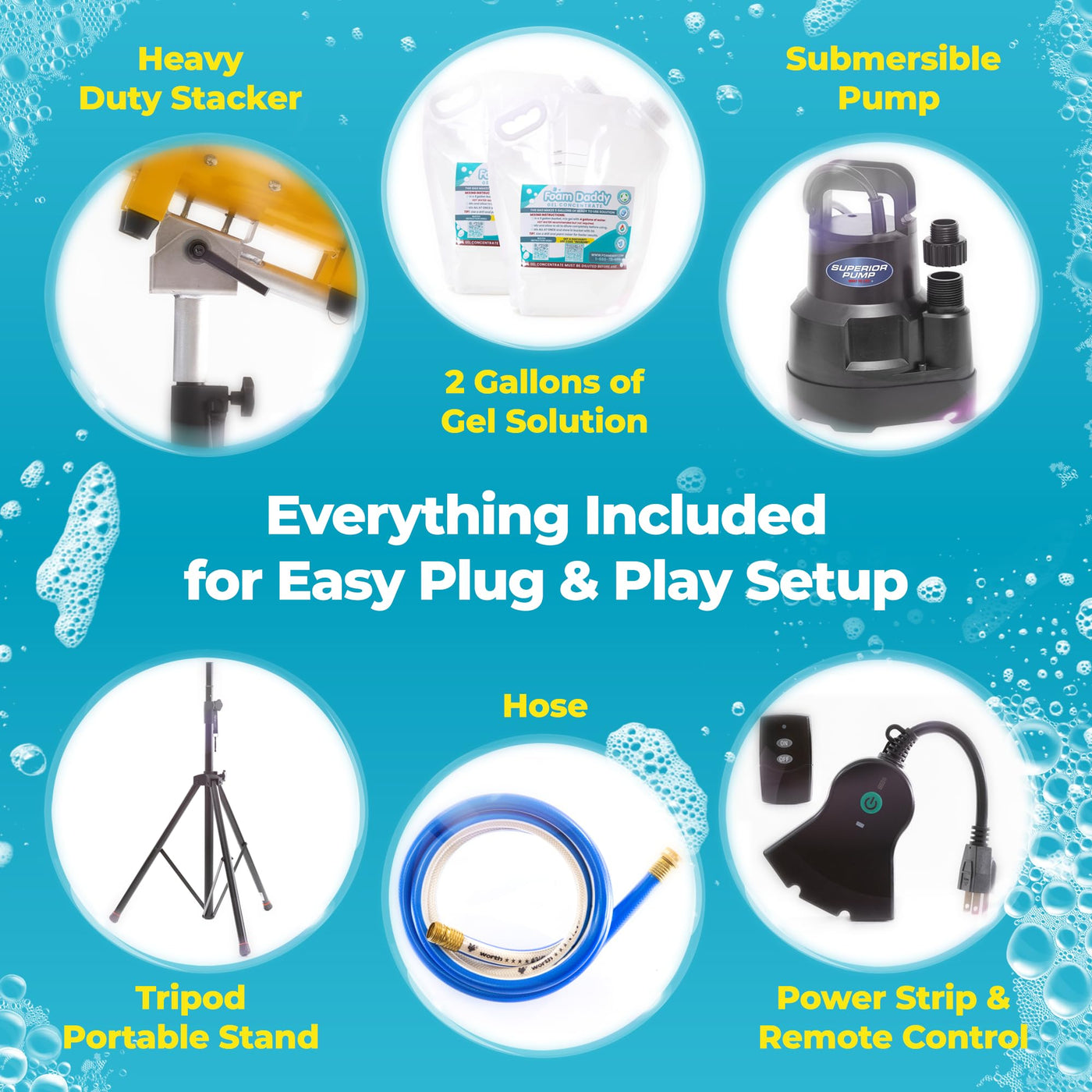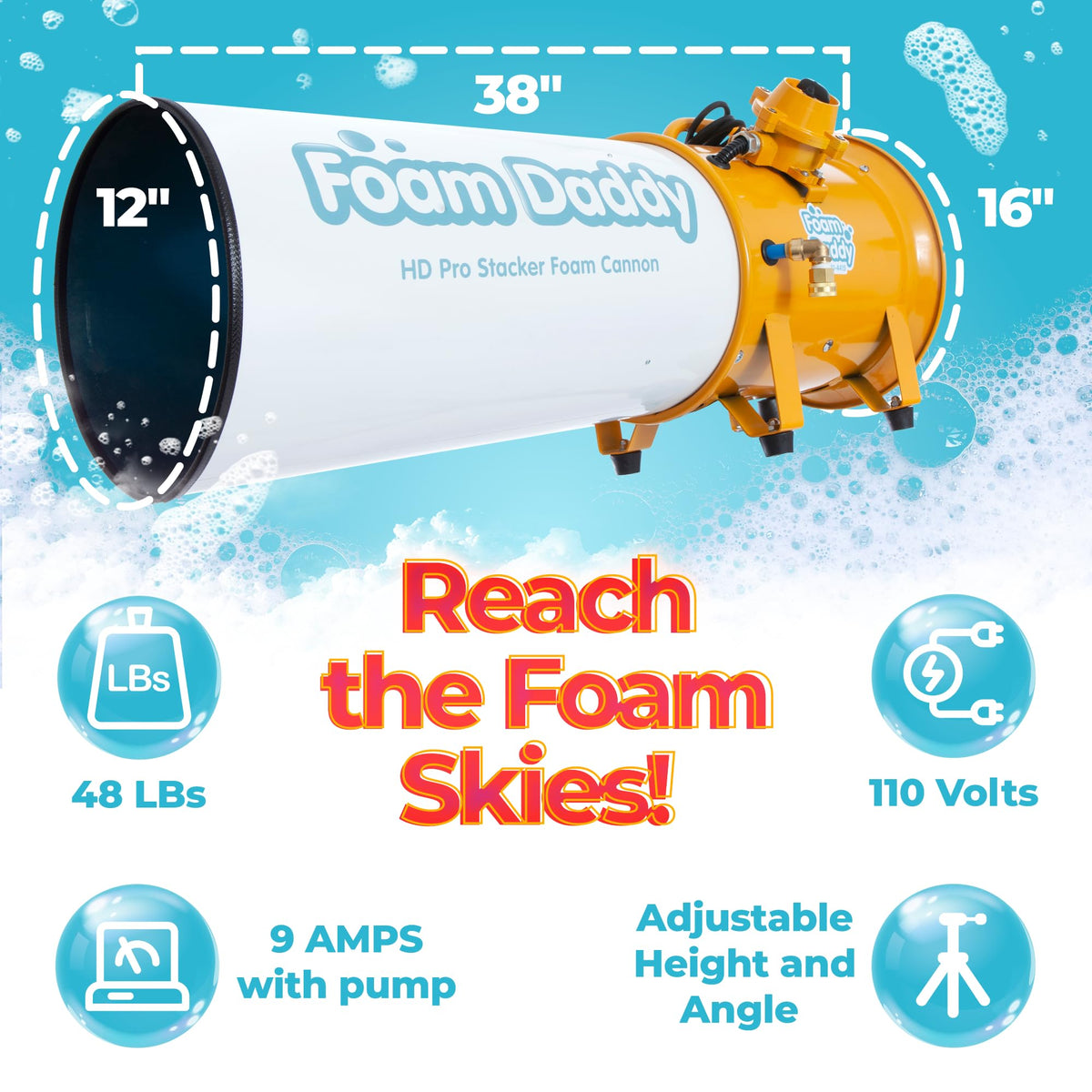 Introducing Foam Daddys Foam Machine Cannon, A Must-Have For Any High-Energy Event That Calls For The Ultimate Foam Experience. Designed And Made In America, This Foam Cannon Is Engineered For Excellence And Tailored For Unforgettable Fun. Lets Talk About What Makes It Special. Powered By A Robust 3/4 Hp Motor And A 120V Submersible Pump, This Foam Cannon Can Shoot Foam As Far As 30 Feet! Whether Its A Music Festival, A Corporate Event, Or A Lively Backyard Party, Youre Ensured To Make A Big Splash. And Dont Worry About Running Out Of Foam-Each Cannon Comes Pre-Loaded With 5 Hours Of Foam Solution. Need More? Extra Solution Can Be Purchased Separately To Keep The Fun Going For Even Longer. We Even Include A Sturdy Stand For Easy Setup, But Please Note That Youll Need To Provide A Few Additional Items. A 50-Gallon Drum For The Foam Solution, A 5-Gallon Bucket With A Lid For Storage, And Any Standard Garden Hose Are Necessary For Operation. Ready To Elevate Your Event To Foam-Tastic Heights? Foam Daddy Is Your Ultimate Partner For Epic Foam Adventures.