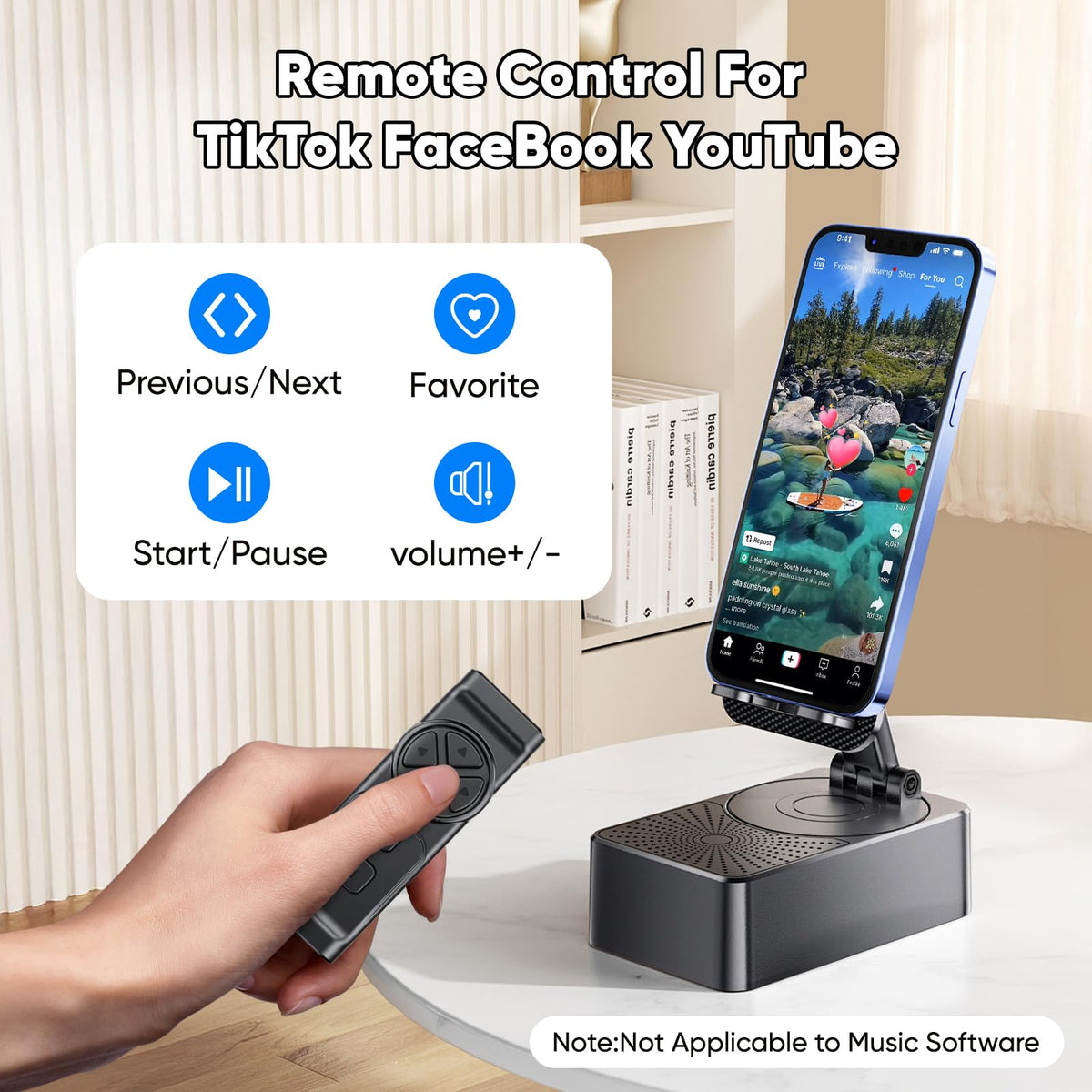 ?Powerful Bluetooth Speaker?This Product Features A More Powerful Built-In Bluetooth Speaker That Allows You To Play Videos, Music, Movies, And Calls With Louder And Clearer Sound, Helping People Hear More Clearly! | ?Smart Remote Control For Hands-Free Browsing?Use The Included Bluetooth Remote To Scroll Tiktok, Pause Netflix, Or Adjust Volume From Across The Room. Turn Any Space Into A Wireless Entertainment Hub With This Cell Phone Stand With Speaker-Ideal For Cooking, Working, Or Chilling On The Couch. | ?Portable Adjustable Cell Phone Holder?This Portable Bluetooth Speaker Phone Stand Has A Foldable Design On The Top And A Weighted Base With A Non-Slip Design On The Bottom. In Order To Ensure Portability While Ensuring The Safety Of The Phone, Whether It Is Placed On The Kitchen Counter, Desk, Or Nightstand Can Be Adjusted 180