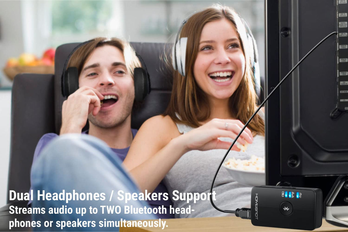 Connect Your Bluetooth Headphones Or Speakers To Your Tvs And Other Devices With High-Quality Digital Audio To Up To Two Bluetooth Headphones Or Speakers. Dual Streaming Bluetooth Connectivity Stereo Audio Streaming To 2 Bluetooth Devices From Your Tv, Computer / Pc, Ipod, Mp3 / Mp4, Car Stereo Etc Simultaneously Instant Auto-Reconnect To Last Connected Devices Connect Your Bluetooth Devices To Homespot Bluetooth Transmitter With One Press Of The Bluetooth Pairing Button And Youre Ready To Listen. From Then On, Re-Pairing Is Automatic For A Hassle-Free Experience. Digital & Analog Connectivity The Connect Offers Both Analog And Digital Audio Inputs For The Widest Compatibility With Old And New Tvs And Other Devices. Audio Sync With Video With Aptx-Enabled Device Enjoy High Fidelity Audio Quality And Minimized Lip Sync Latency With Aptx-Enabled Device. Packaging Includes Homespot Bluetooth Transmitter With S/Pdif (Optical) Input 1 X Optical Toslink Audio Cable 1 X 3 3.5Mm Audio Cable 1 X 3 Rca Cable 1 X 3 Micro Usb Cable Instruction Manual Demo Video : Https://Youtu.Be/Uuclwqzy6T0 Important Notice Homespot Btadp-128-D Only Supports Uncompressed Pcm Audio Signals And Does Not Support Lossy Compression Such As Dolby Ac-3, Dts, Or Other Surround Sound Signals. Therefore, It Is Important That The Digital Audio Output Of Your Device Defaults To Or Can Be Set To Pcm/Lpcm Output. Otherwise The Sound Output Will Be Noise/Static.