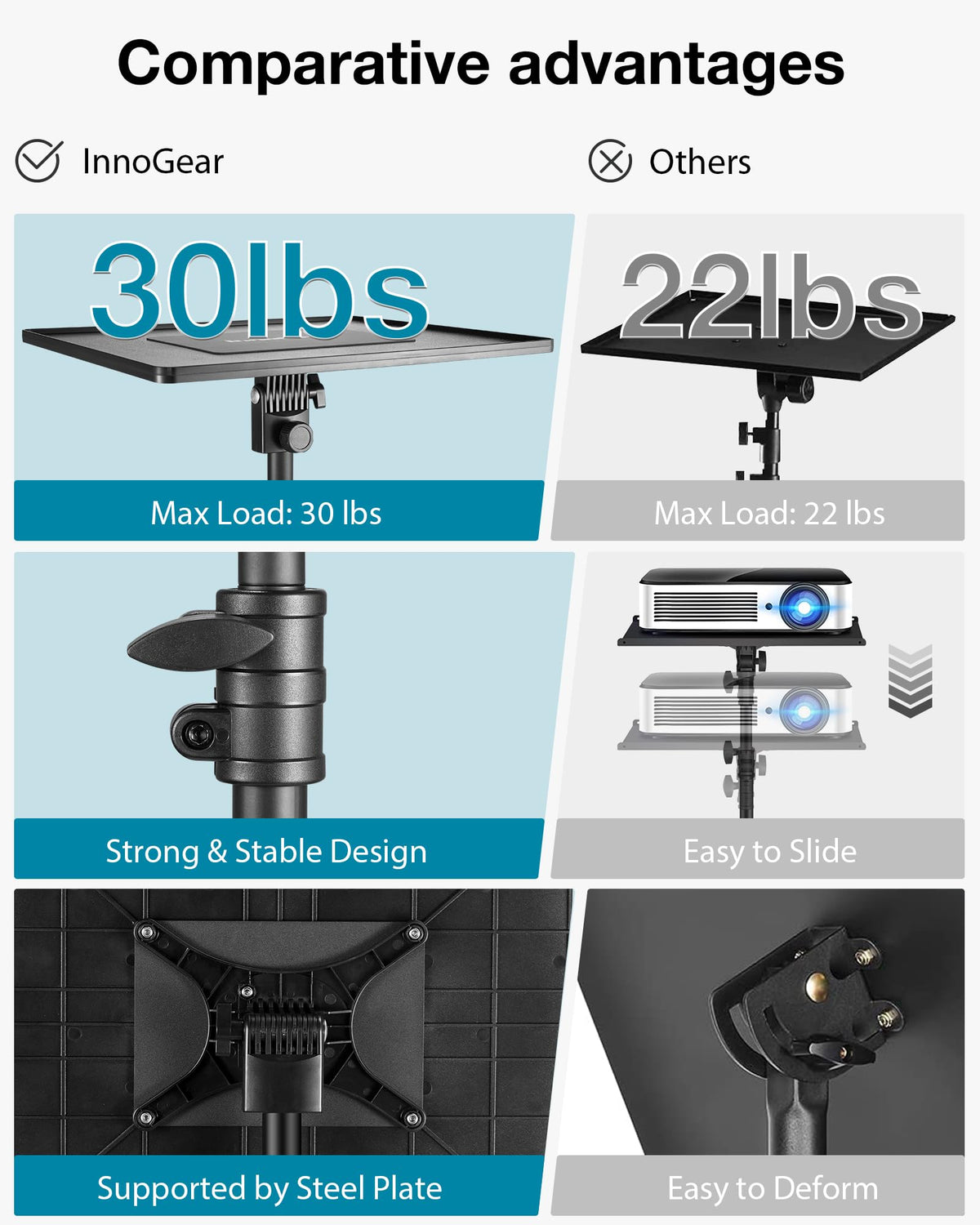 Innogear Professional Projector Stand Is Engineered To Elevate Your Presentations To New Heights. With An Enhanced Load Capacity Of 30 Lbs, It Confidently Supports Your Projector And Laptop, Ensuring Seamless Performances Every Time. The Sturdy Tripod Design, Crafted From Premium Steel, Provides Unparalleled Stability Indoors Or Outdoors, While Non-Slip Rubber Feet Prevent Tip-Overs, Allowing You To Focus On Your Content. Adaptability Meets Convenience With Adjustable Height Ranging From 21.0 To 38.0 Inches, Catering To Your Preferred Standing Or Sitting Positions. Portable And Easy To Assemble, It Folds Into A Compact Size For On-The-Go Presentations. The Flexible And Stable Tray Offers A Generous Surface Area And 360 Angle Adjustment, Safeguarding Your Equipment With Reinforced Steel And Non-Slip Pads. Unleash Your Creativity With Versatile Applications, Accommodating Projectors, Laptops, Recorders, Sound Media, And Dj Equipment. Whether For Home Theater, Office Presentation, Outdoor Movie Night, Studio Recording, Or Stage Performance, Our Projector Stand Is The Ultimate Companion, Empowering You To Deliver Memorable Experiences Effortlessly.