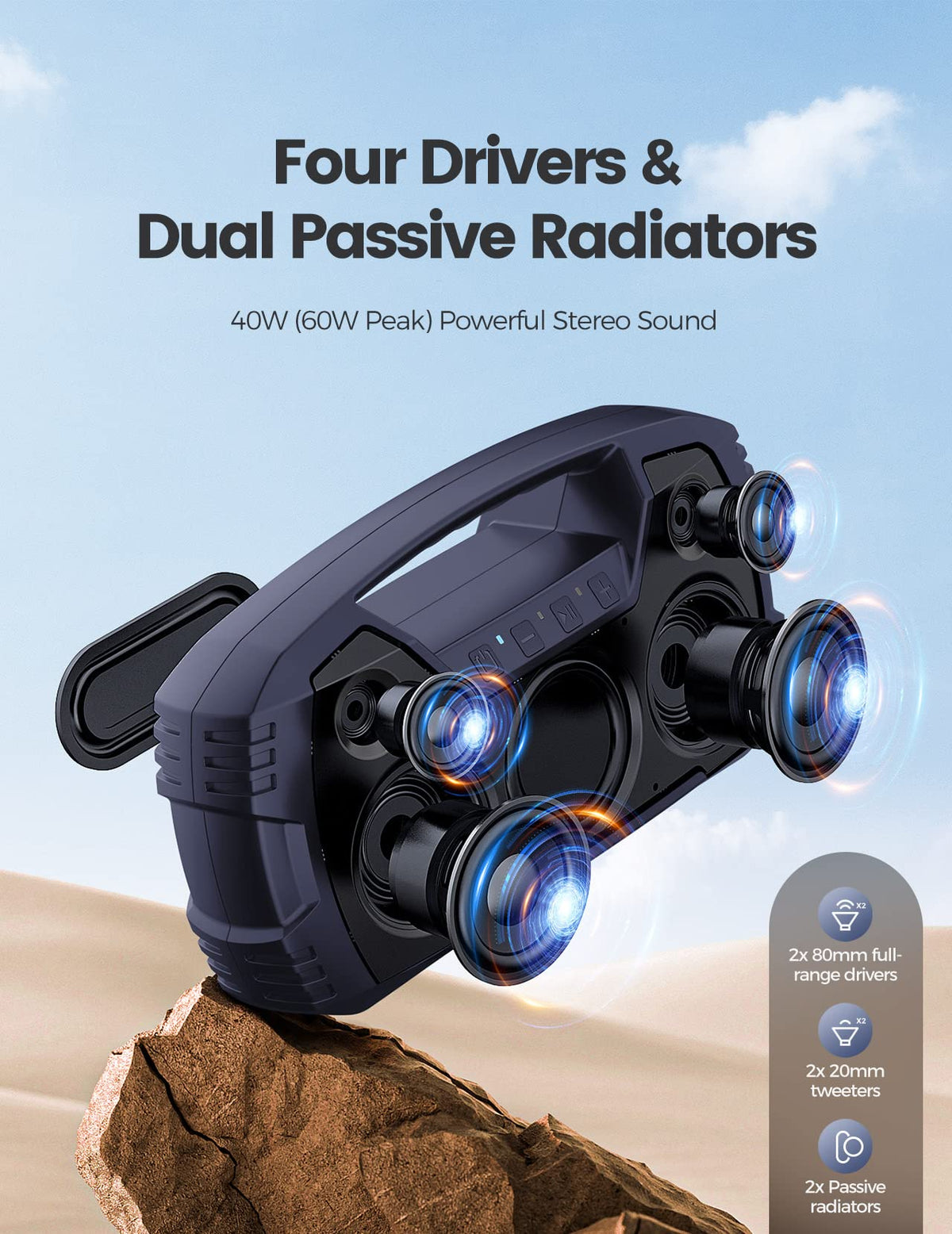 Ipx7 Waterproof Bluetooth Speaker, 40W Portable Wireless Speaker, 32H Playtime, Stereo Loud Sound, Deep Bass, Outdoor Speaker Wi