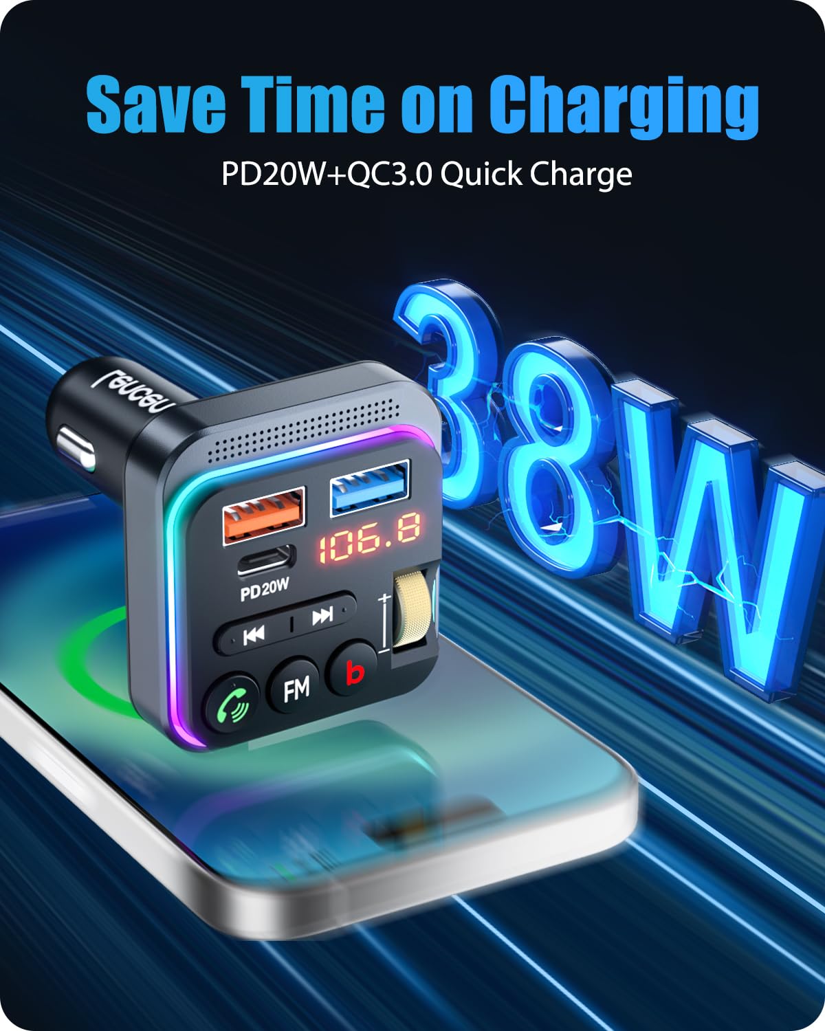 Lencent Bluetooth 5.0 Fm Transmitter For Car, [Pd 20W + Qc 3.0] Usb Charger Music Radio Adapter, Wireless Microphone &Hifi Bass