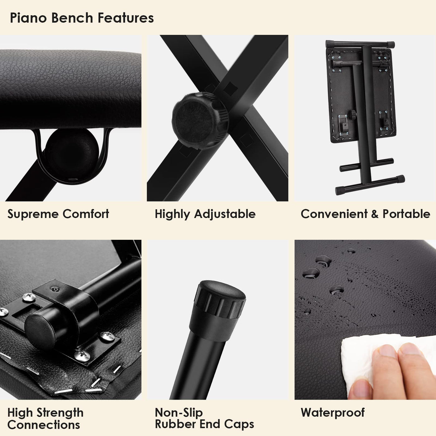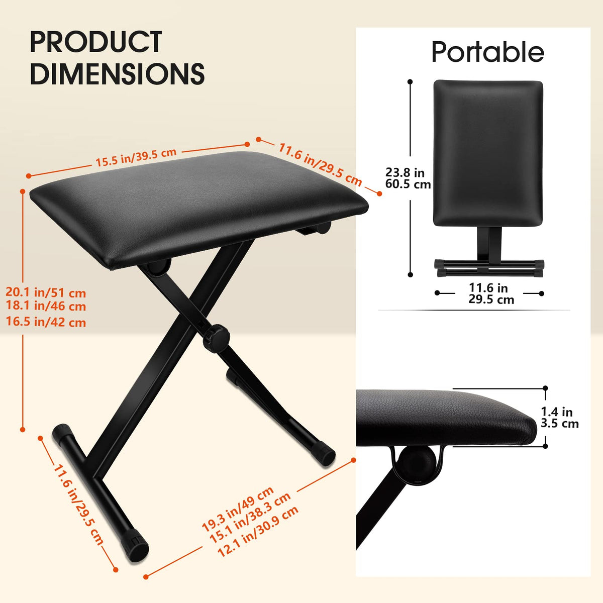 Letsrock Piano Bench, Keyboard Bench X-Style Padded Adjustable Portable Stool Collapsible Chair Foldable Seat Waterproof Non-Slip, Black
