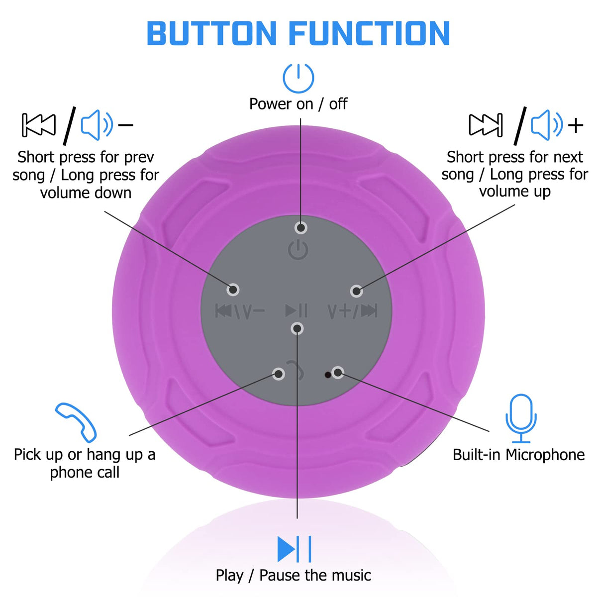 Q: Does the speaker have a built-in microphone for hands-free calls?A: Yes, this speaker includes a built-in microphone, allowing you to enjoy hands-free phone calls even while you're in the shower. You can easily switch music and control volume with button operations.