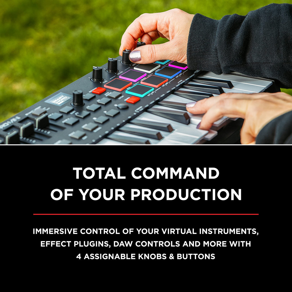 Join The Prosm-Audios Oxygen Pro Mini Is A Powerful And Portable, 32-Key Usb Powered Midi Controller Complete With An Arsenal Of Must-Have Production Tools To Streamline Your Creative Process. Fusing 32 Best-In-Class, Velocity-Sensitive, Semi-Weighted Mini Keys With A Built In Arpeggiator, 8 Rgb, Backlit, Assignable, Velocity-Sensitive Drum Pads With Note Repeat, 4 Assignable Knobs, Buttons And Faders, Oxygen Pro Mini Comes Complete With Everything You Need To Get The Most Out Of Your Virtual Instrument Collection And Daw.Seamless Daw & Performance Control With Auto-Mappingwith The Easy To Read Oled Screen, Configuring The Oxygen Pro Mini With Any Mainstream Daw Couldnt Be Simpler. Whether You Use Mpc Beats, Ableton Live, Cubase, Logic, Studio One Or Any Other Music Making Platform, Simply Select The Map And Auto-Mapping Will Take Care Of The Rest.Premium Software Suiterecord, Sequence, Arrange And Mixdown Your Tracks With A Choice Of Two Professional Daws Including Mpc Beats And Ableton Live Lite. Find And Create Any Sound Imaginable With A Virtual Instrument Collection From Legendary Developer Air Music Tech And Dive Into A World Of Cutting-Edge Sound Content With A Collection Of Expansion Packs From Akai Professionals Legendary Mpc Series.