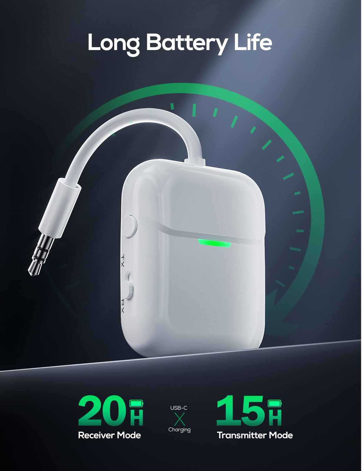 Q: What is the battery life of the Nulaxy Bluetooth Transmitter Receiver?A: The Nulaxy Bluetooth Transmitter Receiver offers up to 20 hours of battery life in receiver mode and 15 hours in transmitter mode. It features quick recharging with a Type-C cable, ensuring you can enjoy your audio for extended periods.