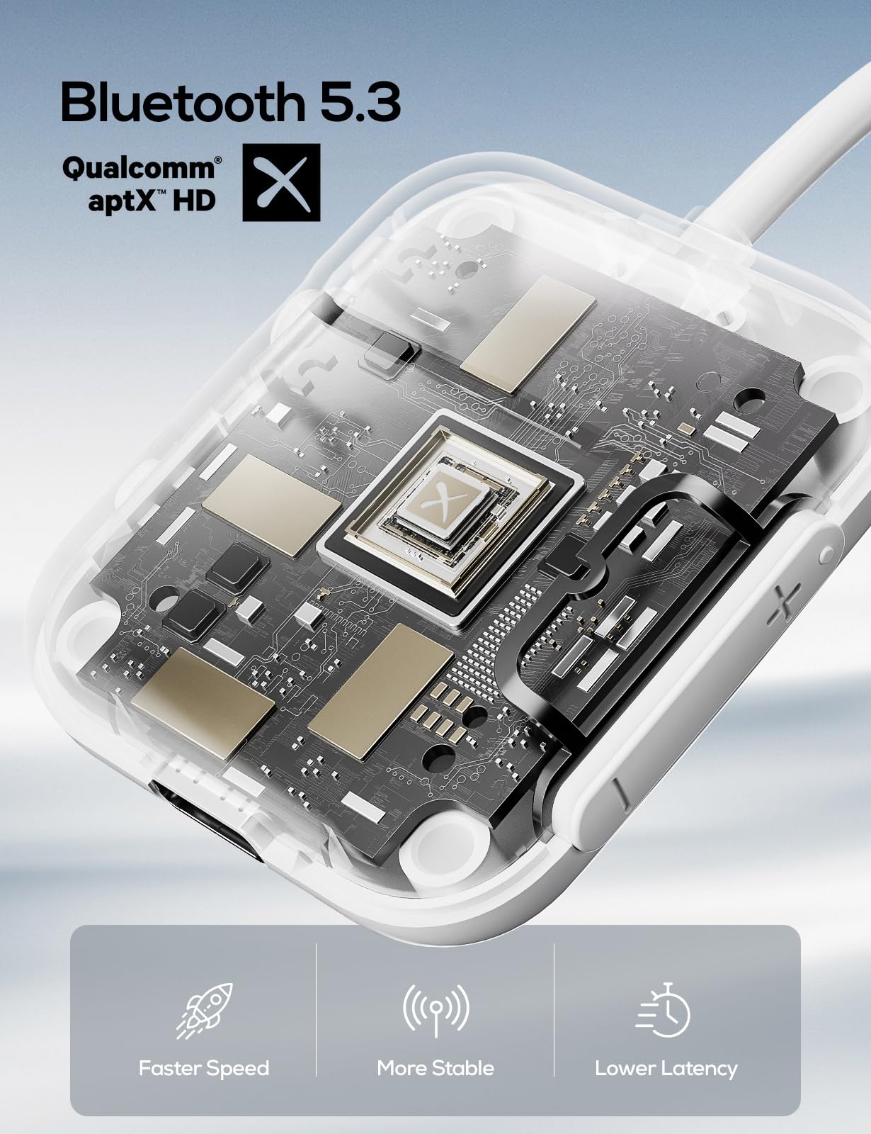 Q: What audio quality can I expect from the Nulaxy Bluetooth Adapter?A: With advanced Bluetooth 5.3 technology and a Qualcomm chipset, the Nulaxy Bluetooth Adapter supports aptX-Adaptive and aptX-Low Latency, ensuring high-quality audio transmission with minimal delay for an enhanced listening experience.