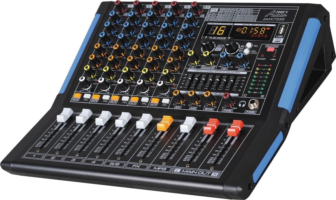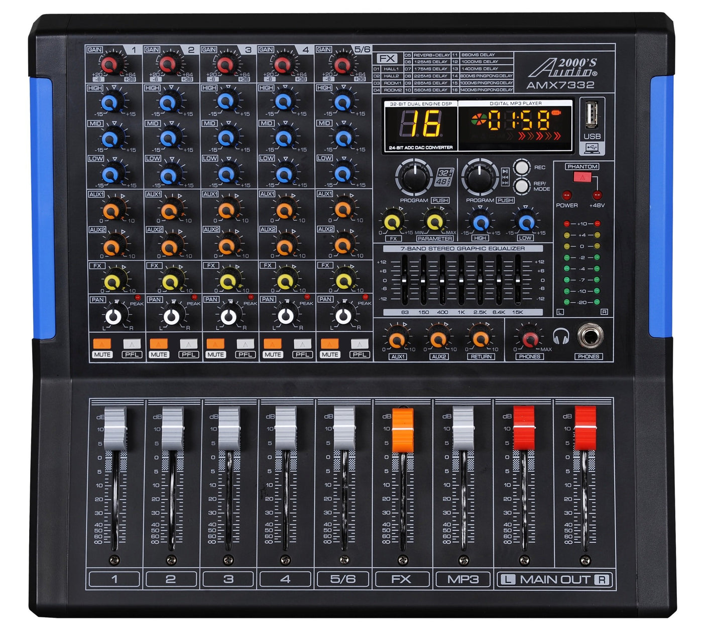 The Amx7332 Is Configured With All The Essential Mixer Features The Capability Of Letting User Connect A Computer To The Usb Interface, The Amx7332 Allows The User To Coordinate This Audio Mixer With A Computer To Record Andor To Perform The Music Replaying Applications Two Aux Outputs,Ultra-Musical 3-Band Eq On All Channels,Microphone + Stereo Line Inputs,Peak Led Indicators On All Channels,Mute And Pfl Control Buttons On All Channels,Aux1, Aux2, And Pan Controls On All Channels,Dual-Led Displays For Dsp And Usb Interface,7-Band Stereo Graphic Equalizer,High-Accuracy Level Indicator,Phantom Power Switch (+48V),Sealed Rotary Control, Knobs To Resist Dust And Grime,Rugged Steel Chassis,Multi-Voltage Power Supply For Worldwide Use