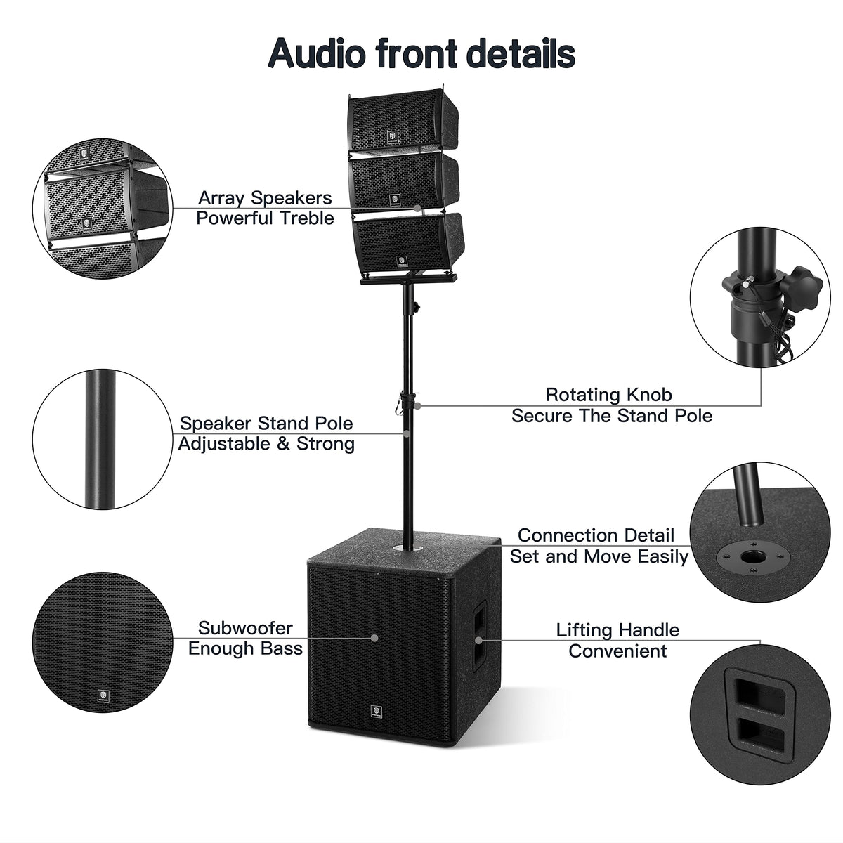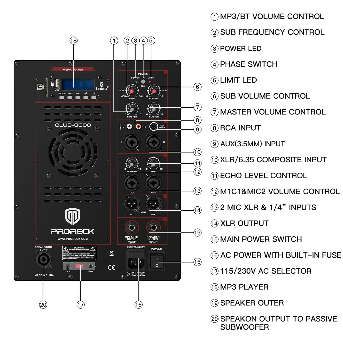Q: What are the key features of the PRORECK Club 8000 speaker system?A: The PRORECK Club 8000 speaker system includes (1) active subwoofer, (1) passive subwoofer, (6) 6-inch line array speakers, Bluetooth connectivity, USB drive and SD card playback options, and a remote control for easy operation.