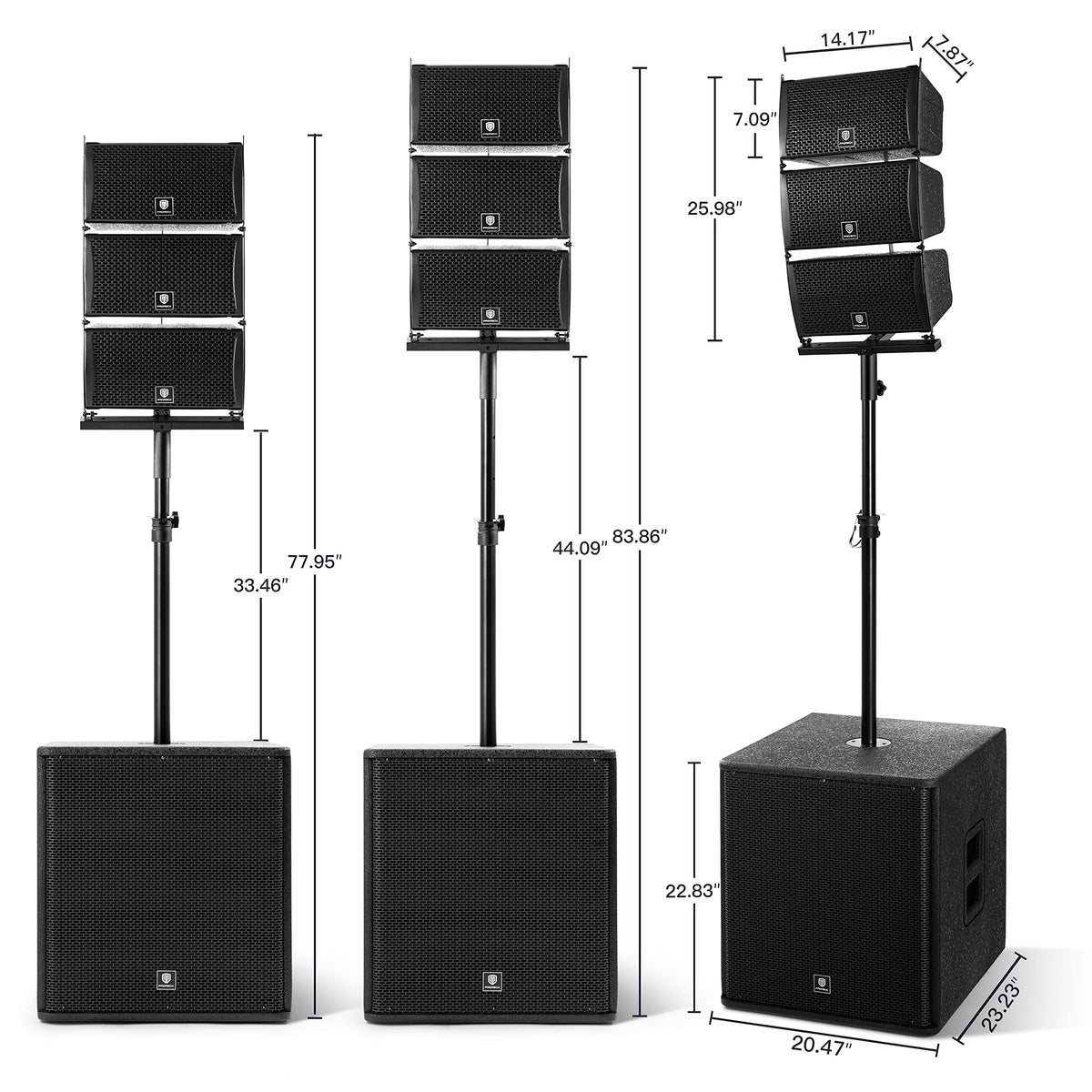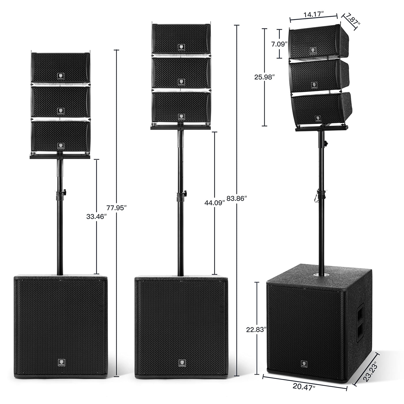 Q: What is the weight and dimensions of the PRORECK Club 8000 speaker system?A: The system is shipped in three separate packages with weights of 95.5 lbs, 83.3 lbs, and 59 lbs. The dimensions are 26.3 x 24 x 25.8 inches for the subwoofer and 28.3 x 16.5 x 20.86 inches for the line array speakers.