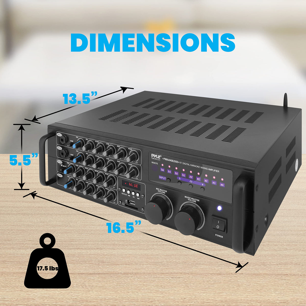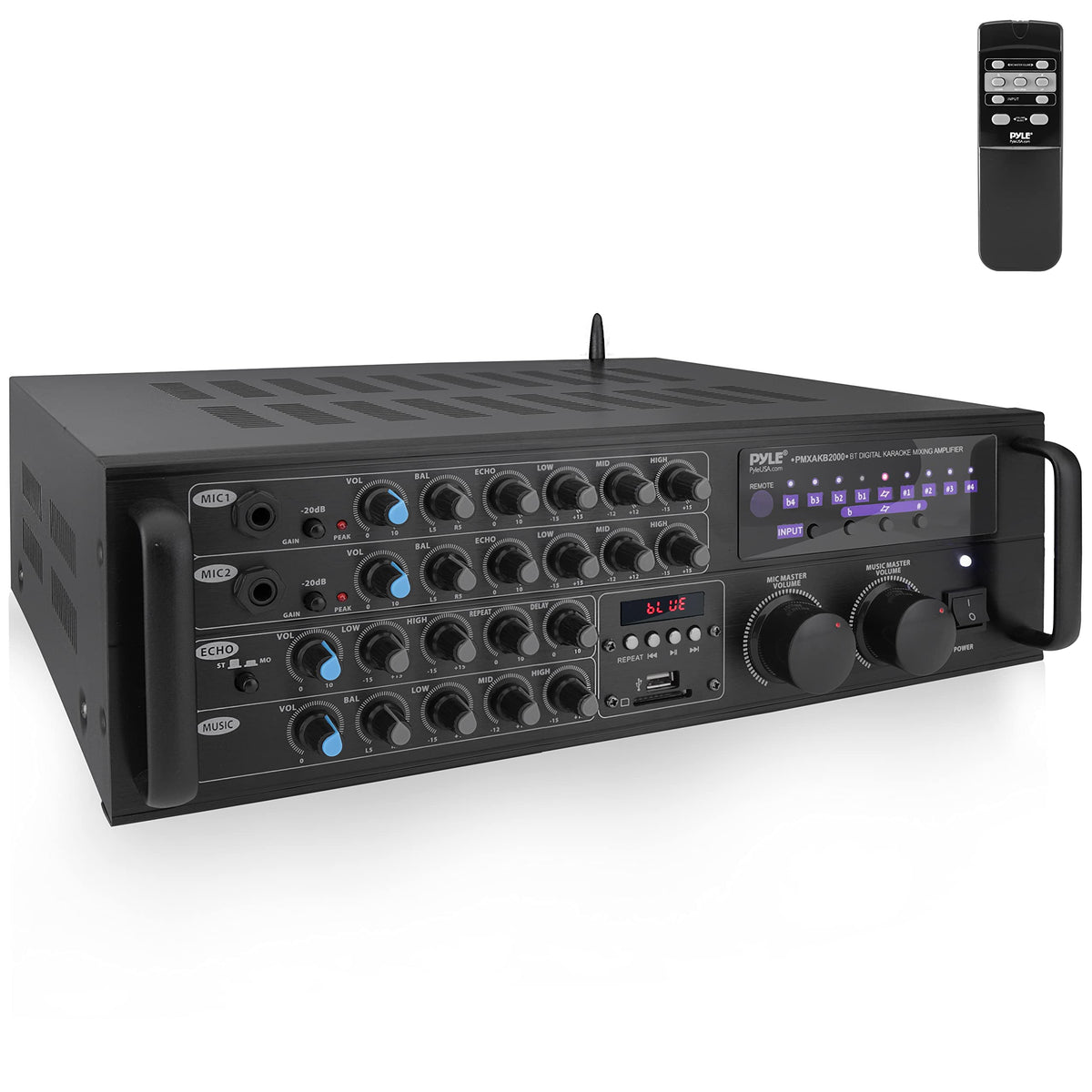 The Pyle Pmxakb2000 Karaoke Mixer Features Bluetooth Wireless Streaming From Your Device. Play Your Entire Mp3 Digital Music Library From Your Cell Phone, Pc Or Tablet. This Rugged Rack Mountable Mixing Amplifier Will Make Your Karaoke Jam One To Remember. The Amplifier Produces A Powerful 2000 Watts (1000W + 1000W At 4 Ohms) Of Power And The Mixer Features Two Microphone Inputs, Two Line Inputs And Two Video I/O Connections. Each Channel Features An Eq Section And Echo Adjustment Dial For Applying Just The Right Amount Of Eq Or Effect To Specific Channels. Additional Features Include Usb And Sd Memory Card Readers For Mp3 Digital Audio File Playback And Lcd Display. All The Professional Karaoke Features Are Built In To This Unit, Including, A 9Step Digital Key Control And Digital Echo. Connect External Devices Like Outboard Effects Processors Using The Effects Loop Input. The Pyle Pmxakb2000 Is Guaranteed To Provide All The Power And Mixing Capabilities For Your Professional Or Private Needs. Music: Low / Mid / High / Balance Controls.