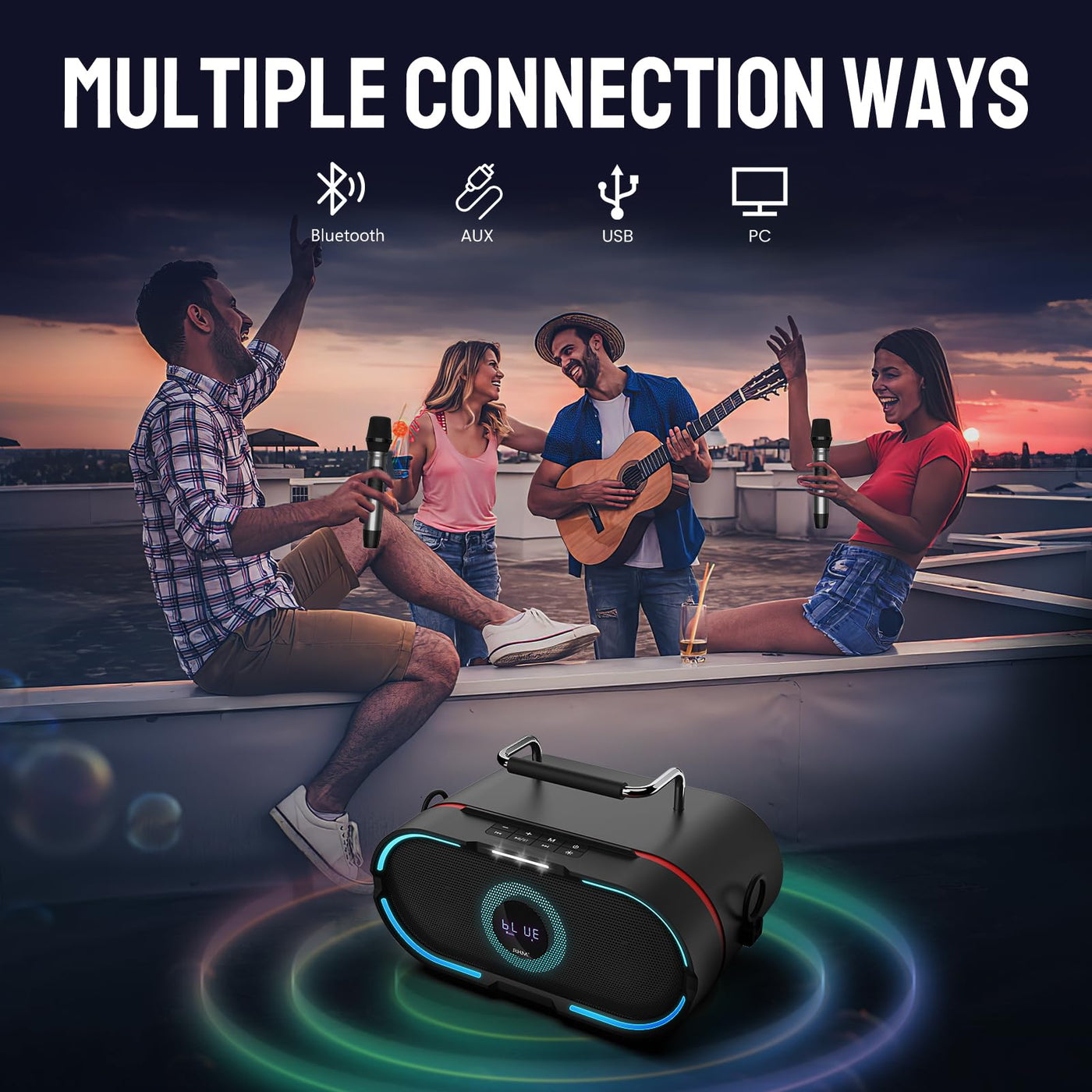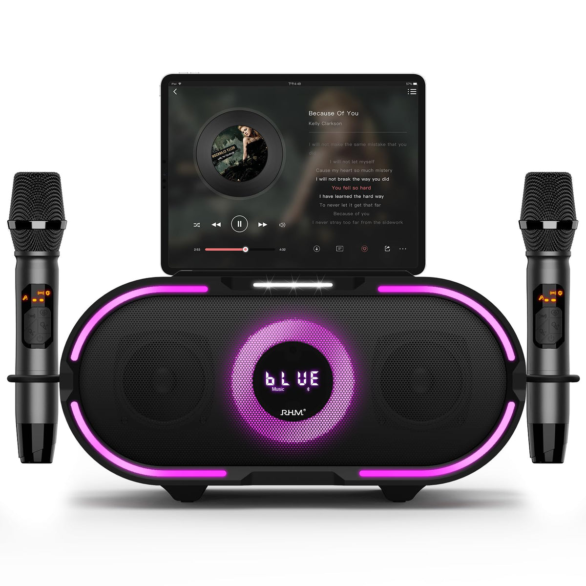 Rhm K666Plus Karaoke Machine With Powerful Sound & Rgb Lights, 2 Wireless Microphones, Rechargeable Battery, 7 Hours Playtime, Support Bluetooth/Aux/Usb/Pc For Home/Party/Wedding/Outdoors/Christmas