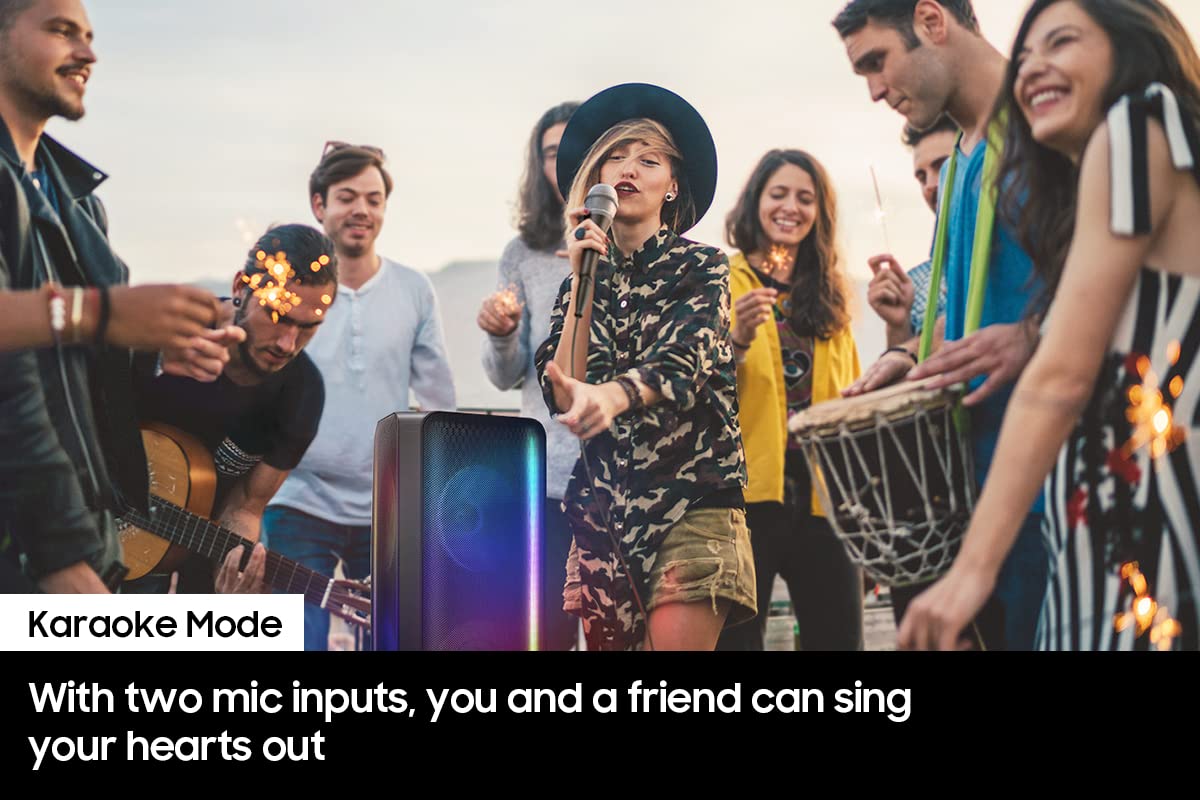 Get The Party Started With The Samsung St50B Sound Tower And Fill The Room With Rich Sound And Led Party Lighting. With The Built In Battery, You Can Take The Sound Tower Almost Anywhere The Party Travels To. Sing Songs On Karaoke Mode Or Pump The Bass To Set The Vibe. Rain Or Shine, Enjoy Year-Round Outdoor Entertainment. Invite Your Friends Over And Connect Two Smart Devices Simultaneously. Download The Sound Tower App To Control Everything From Built-In Led Lighting To Sound Effects Right From Your Android Or Ios Device.Battery Life Will Vary Depending On Applications Loaded On The Product And Power Management Setting Used By The Consumer. Protection From Water Conditions Based On Ipx5 Standard. Can Resist A Sustained, Low Pressure Water Jet Spray, Projected By A Nozzle (6.3 Mm (0.25 In)) Against Enclosure From Any Direction. Images Are Simulated And For Illustration Purposes Only. Requires Bluetooth Compatible Devices. Connect Up To 10 Wireless Or Wired.