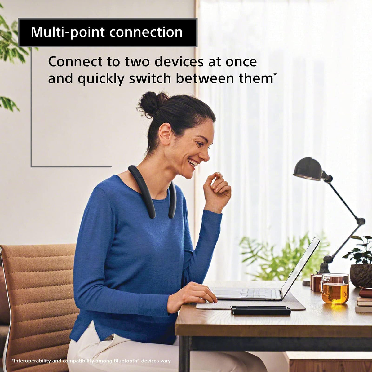 Change how you work from home with the personalized audio of the SRS-NB10 Wireless Neckband Speaker. Simply place the speaker on your shoulders for sound that is optimized for your ears alone. Take work calls and be heard with the integrated microphone powered by Precise Voice Pickup Technology.