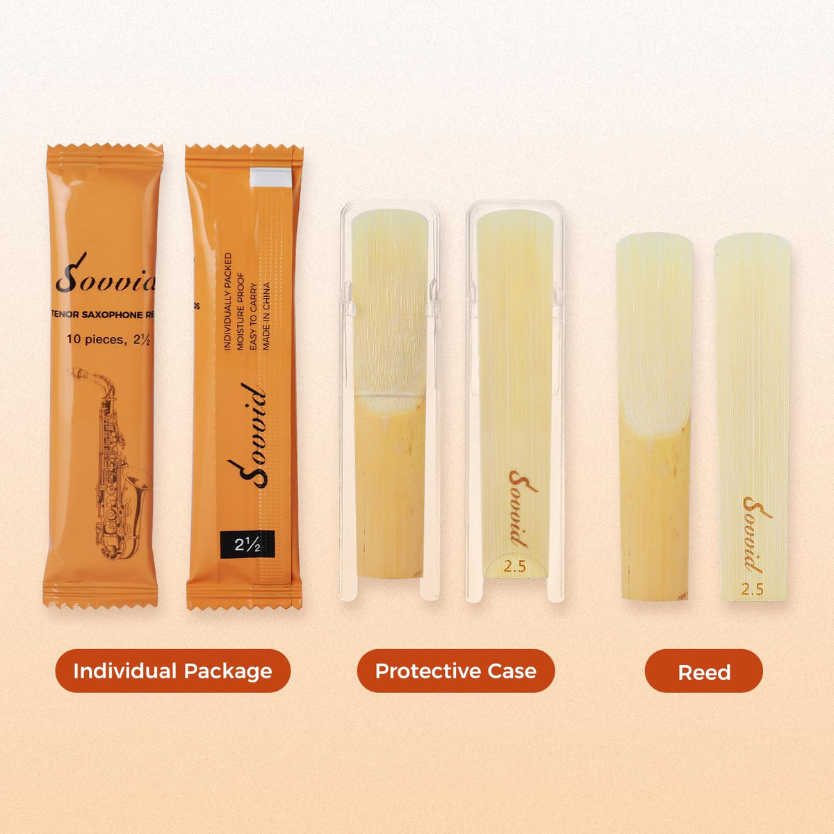 Sovvid Tenor Saxophone Reeds Strength 2.5 With Portable Reed Case, Box Of 10, Individually Packaged Tenor Sax Reeds, Laser Engraved Marking & Thinner Reed Tip & Unfiled Cut For Ease Of Play