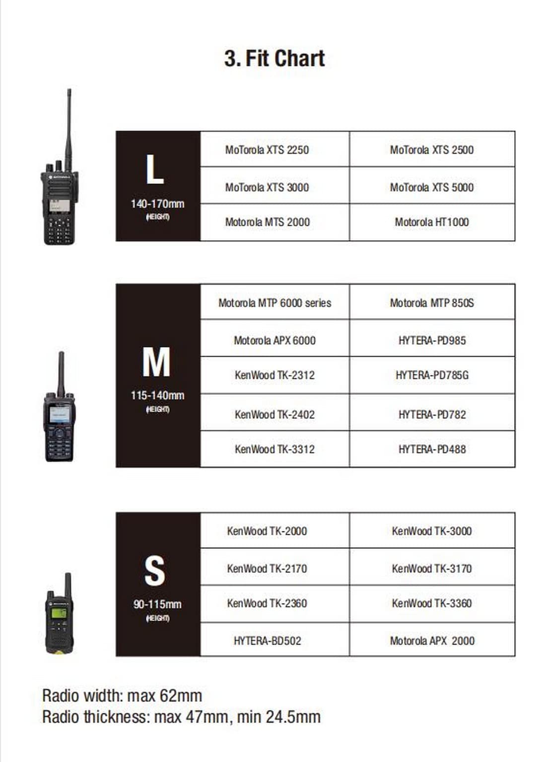 Q: What walkie talkie models are compatible with the Tactical Scorpion Gear Polymer Holster?A: This holster is designed to fit various walkie talkie models including Motorola XTS 2250, 2500, 3000, 3500, 5000, MTS 2000, MTP 6000 series, HT1000, APX 6000, as well as Hytera PD785, PD785G, PD488, PD782, PD985, and Kenwood TK-2000, 3000, 2170, 3170 models.
