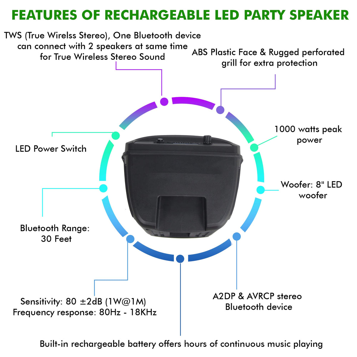 Technical Pro 8 Inch Portable 800 Watts Bluetooth Speaker With Woofer & Tweeter, Festival Pa Led Speaker With Bluetooth/Usb Card
