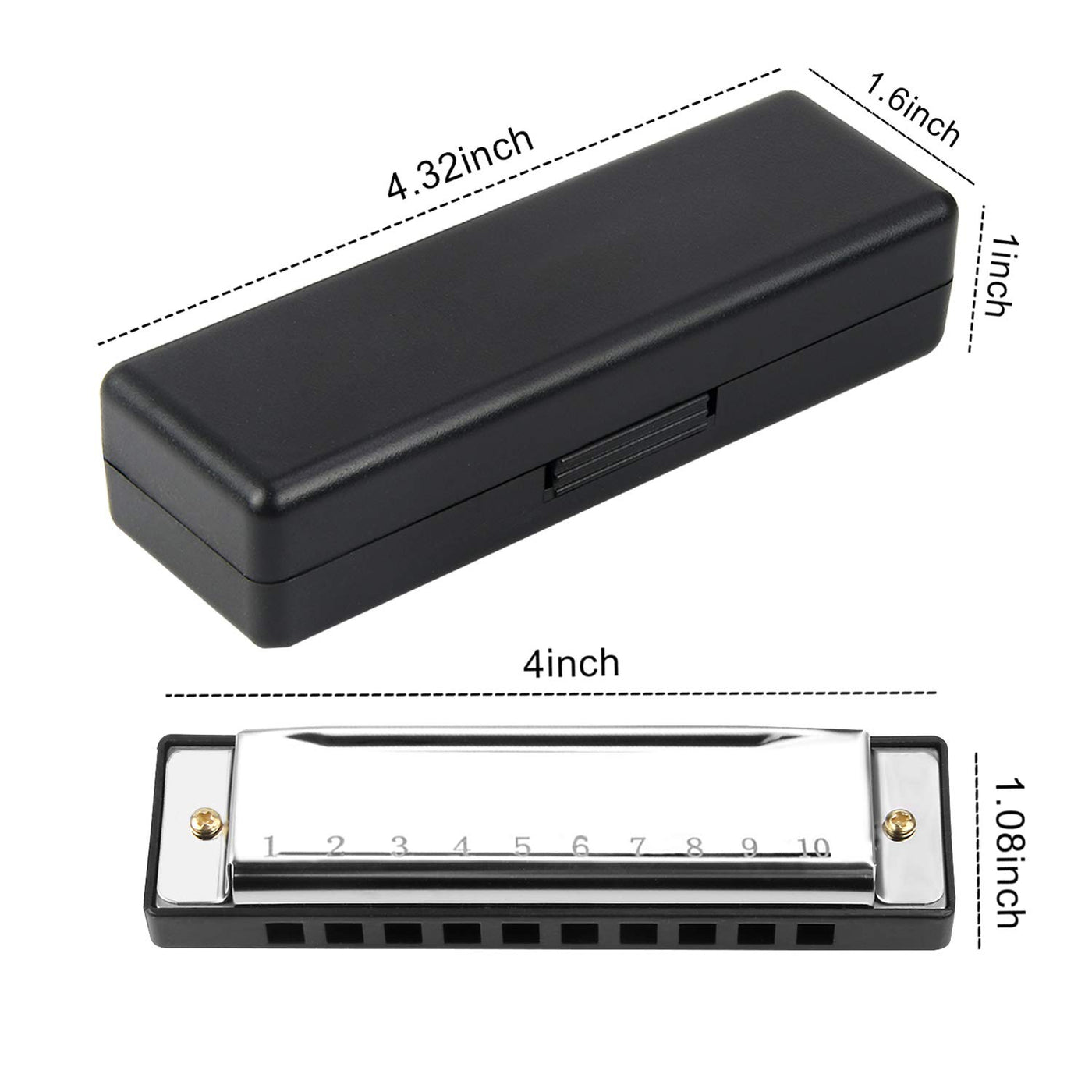 Features: This Set Key Of C Harmonica Can Play A Variety Of Simple Music, It Is A Perfect Musical Instrument Gift For Beginners. Specifications: Material: Titanium, Abs Resin And Copper. Color: Gold, Purple, Green, Blue Size: 4 X 1.08 X 0.88 Product Packaging: Black Plastic Box Packaging Size: 4.32 X 1.6 X 1 Weight: 65G Package Contents: 4 * C-Key Harmonica 4 * Black Harmonica Case 4 * User Manual With Music Score