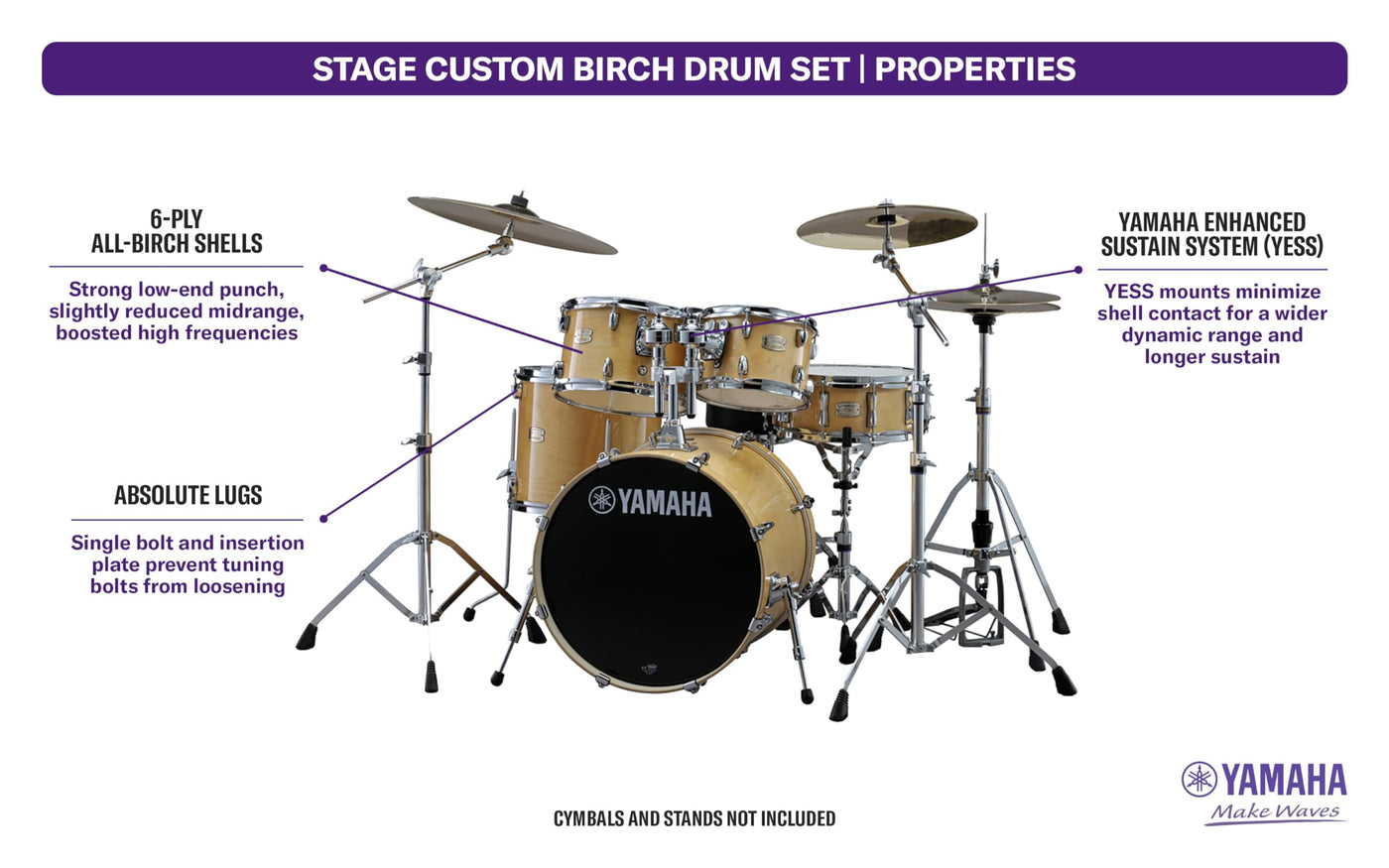 Yamaha Stage Custom Birch Drum Shell Packs Are Great For Beginners Or Working Professionals. The Staggered Diagonal Seam Allowed To Build A Thin Drum Shell That Will Start Round And Stay Round. The Low-Mass Lugs Lets The Shell Vibrate For Superb Tone And Sustain. Air Seal System Used For Drum Shell Construction Ensures Each And Every Drum Shell Is Of Uniform Thickness And Is Perfectly Round To Achieve Superior Tone Quality And Durability. Features A Beautiful High-Gloss Lacquer Finish. Hardware And Cymbals Sold Separately